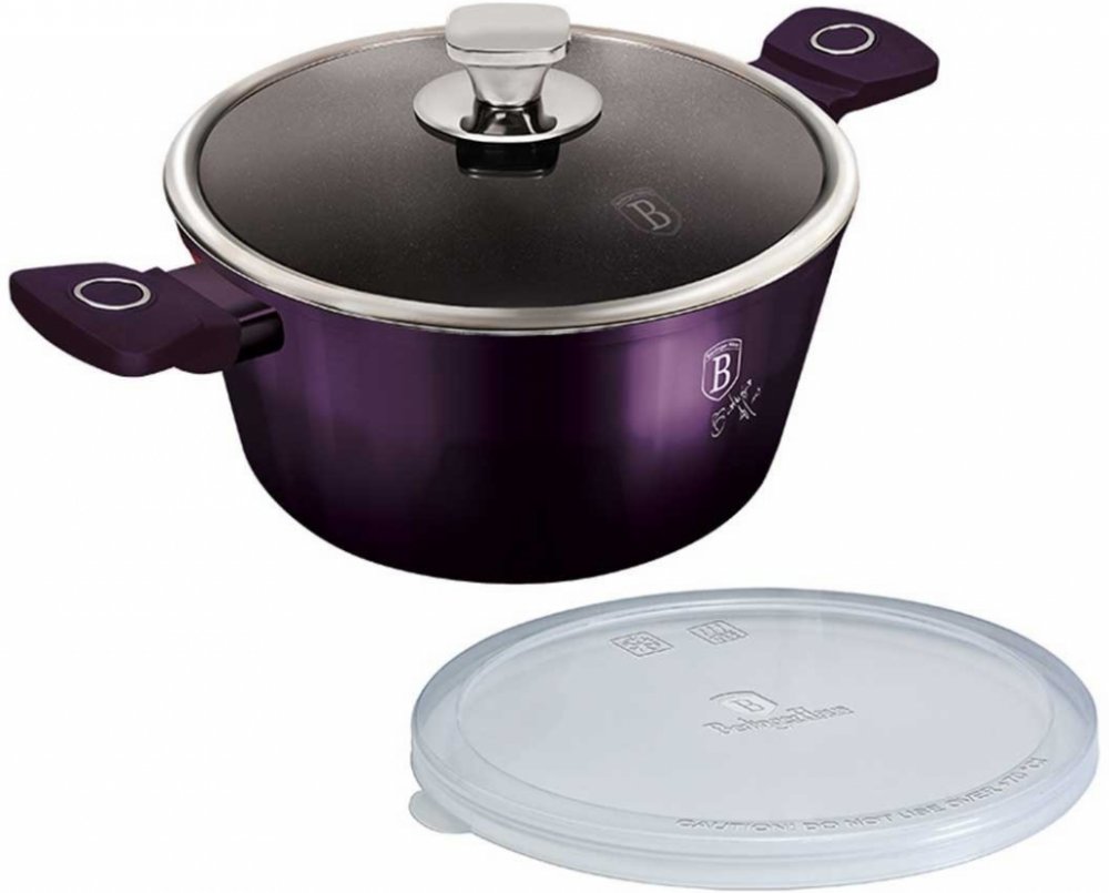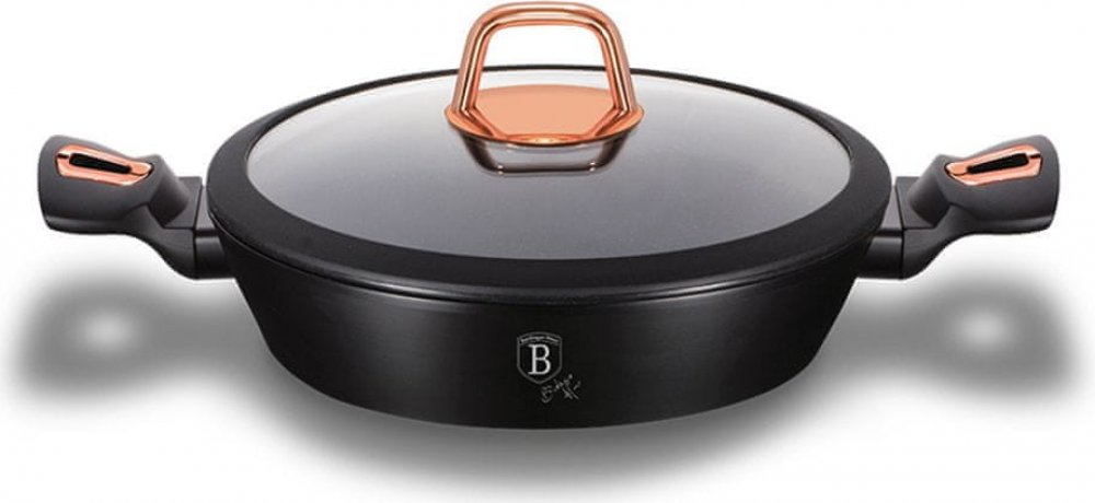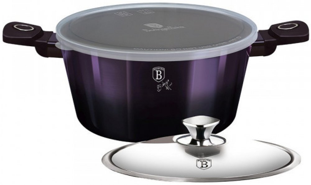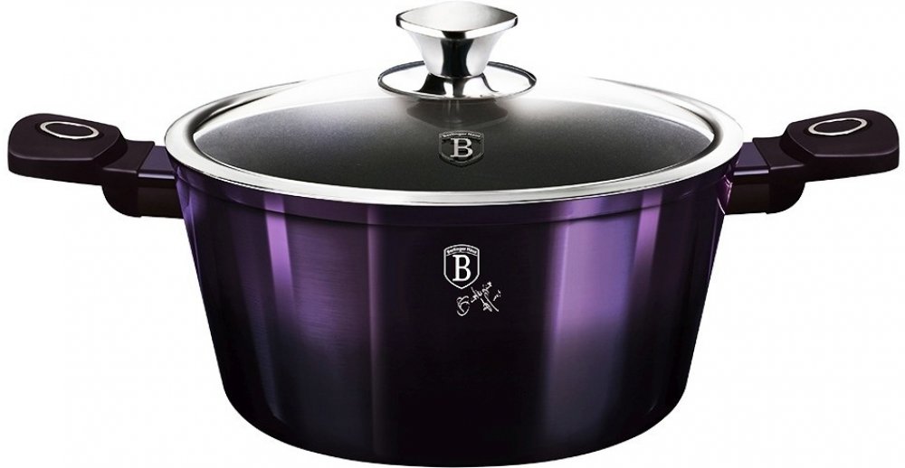 Berlingerhaus Kastrol s poklicí z Purple Eclipse kolekce má průměr horního okraje 30 cm a nabízí objem 6,1 litru. Tento kastrol je vybavený titanovým povrchem, který zajišťuje dokonalou nepřilnavost a snadné čištění. S kovaným hliníkovým jádrem a zesíleným nerezovým Turbo indukčním dnem je kastrol stabilní, rychle se zahřeje a udržuje teplotu rovnoměrně. Ergonomické rukojeti s protiskluzovou měkkou úpravou zajišťují pohodlný a bezpečný úchop, zatímco izolační prvky udržují rukojeti chladné. Skleněná poklice s okrajem z nerezové oceli 18/10 a integrovaným otvorem pro regulaci páry je ideální pro kontrolované vaření. Kastrol je vhodný pro všechny typy sporáků, včetně indukce, a může být použit i v troubě do teploty 160°C. Lze ho snadno umýt ručně teplou vodou nebo v myčce na nádobí. Díky své moderní fialové metalické barvě a perfektnímu designu je ideální nejen pro vaření, ale i pro přímé servírování pokrmů na stůl.