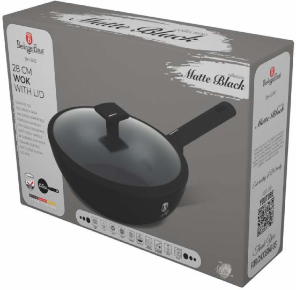BerlingerHaus Matte Black Collection Pánev WOK s titanovým povrchem a poklicí 28 cm je ideální pro přípravu asijských receptů. nepřilnavým hliníkovým To znamená, že připravíte vždy jen skvělé jídlo bez připálení a zároveň můžete s klidem k vaření používat kovové neostré náčiní. Vrchní okraj pánve má velikost 28 cm. Zatímco budete jíst, pánev můžete omýt v myčce nádobí. Jako doplněk k pánvi Wok obdržíte pokličku pro dušení masa i přípravu omáček. Proč si koupit BerlingerHaus Matte Black Collection Pánev WOK s titanovým povrchem a poklicí 28 cm Pánev Wok BerlingerHaus má nepřilnavý povrch Wok dostanete i s poklicí Vhodná do myčky na nádobí Rukojeť je ergonomicky tvarovaná i protiskluzová Průměr vnějšího okraje pánve: 28 cm Co se týče výšky, má pánev Wok 7,4 cm Další funkce a příslušenství pánve Wok BerlingerHaus Rukojeť se pyšní ještě jednou věcí, a to, že je ergonomicky tvarovaná a protiskluzová. Padne tak do ruky jako ulitá.