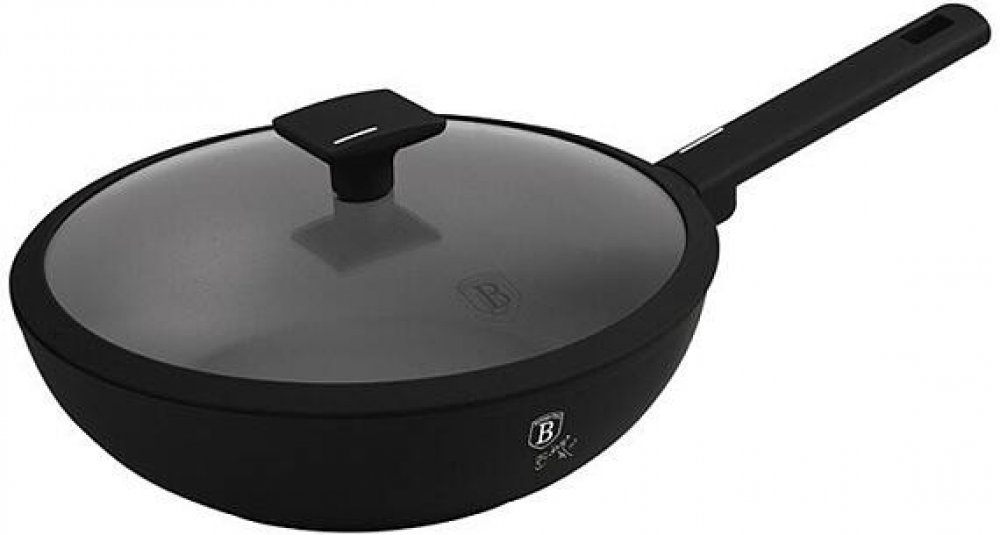 BerlingerHaus Matte Black Collection Pánev WOK s titanovým povrchem a poklicí 28 cm je ideální pro přípravu asijských receptů. nepřilnavým hliníkovým To znamená, že připravíte vždy jen skvělé jídlo bez připálení a zároveň můžete s klidem k vaření používat kovové neostré náčiní. Vrchní okraj pánve má velikost 28 cm. Zatímco budete jíst, pánev můžete omýt v myčce nádobí. Jako doplněk k pánvi Wok obd...