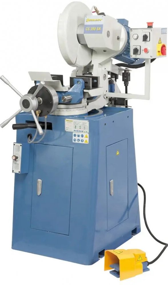 Poloautomatická kotoučová pila Bernardo CS 350 SA Poloautomatická kotoučová pila Bernardo CS 350 SA je určena speciálně pro úsporné řezání jednotlivých dílů a malých sérií. Proto je tento stroj určen pro firmy, které potřebují spolehlivý stroj pro každodenní řezání. Kotoučová pila na kov Bernardo CS 350 SA - Specifikace Přesný samostředící dvojitý svěrák s pneumatickým ovládáním Optimální ochrana při řezání pomocí automatického otevření krytu Těžký rám stroje, připravený k přidělání různých dopravníků Převodovka s kluznou spojkou - zabraňuje roztržení pilového kotouče Výkonný chladicí systém v základní výbavě stroje Pneumatické spouštění řezací hlavy 2 řezné rychlosti - ideální pro řezání profilů, trubek a pevných materiálů ze železa, oceli a neželezných kovů