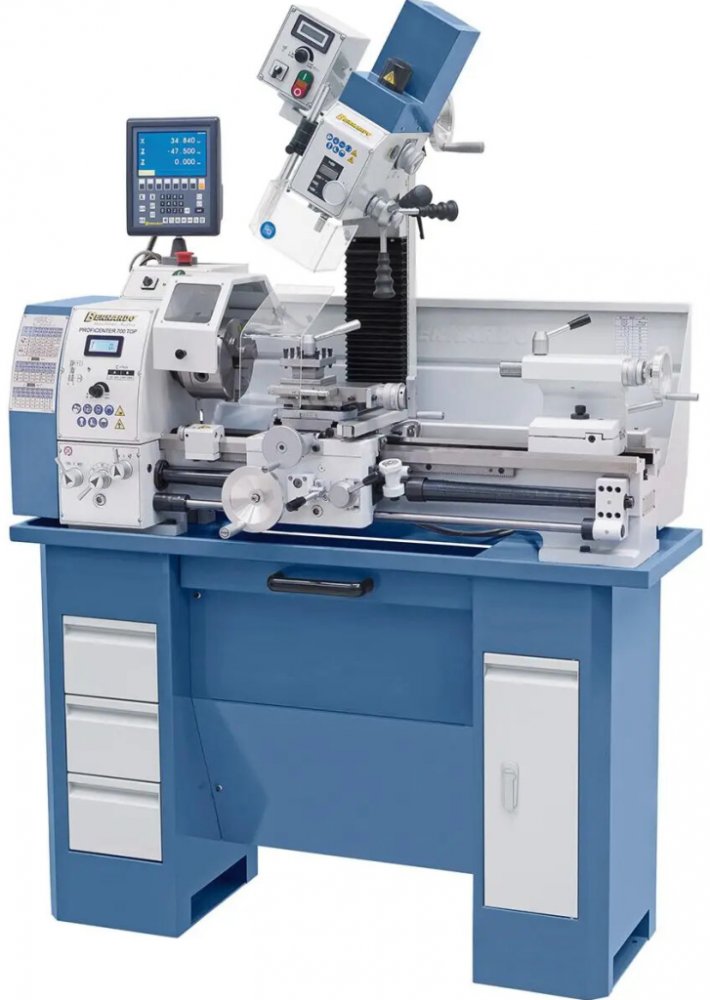 Kombinovaný soustruh s frézovacím nástavcem, frekvenční měnič otáček, napájecí napětí 230 V, výkon 1100 W, točná délka 700 mm, točný průměr nad ložem 300 mm, otáčky (2 st. - plynule) 70 ÷ 2000 U.min-1, kužel vřetena MK 5, průchod vřetena 38 mm, kužel pinoly MK 3, zdvih pinoly 85 mm, rozměry 1380 x 640 x 1020 mm