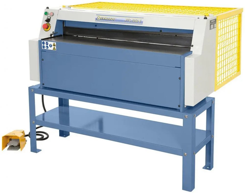 Elektrické precizní tabulové nůžky Bernardo PTS 1050 E Stolní, nohou ovládané, padací nůžky s elektrickým pohonem stříhající ocelové, mosazné, hliníkové plechy do tloušťky 1 mm a šířky až 1050 mm. Zakrytované tabulové nůžky s litinovým stolem a paralelním délkovým dorazem Ovládání spouštění nůžek je prováděno nožním pedálem, volné ruce zůstávají pro optimální polohování plechu Nůžky mají uživatelsky jednoduché a příjemné ovládání Nastavení délkového dorazu posuvného na vodicích tyčích s přehlednou milimetrovou stupnicí (zajištění kličkou s excentrem) Včetně stavitelného dorazu s úhlovou stupnicí 0 - 180° na pracovním stole pro pokosové střihy Přesná práce díky integrovanému osvětlení místa střihu Břity nůžek jsou vyrobené z kvalitní oceli, zaručují čisté a kvalitní řezy bez otřepů Plechy jsou při střihu automaticky upnuty průchozím přítlačným držákem - mohou být střihány i delší listy