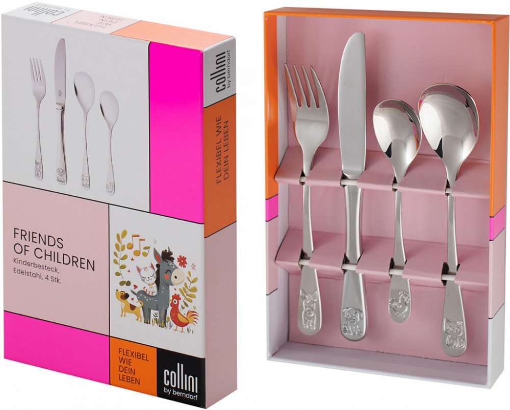 Dětský příbor Berndorf Friends of Children se inspiroval pohádkou Brémští muzikanti. Tvoří ho vidlička, nůž, lžíce a lžička, které zdobí na rukojetích motivy zvířátek motivující děti k jejich používání. Dětský příbor Berndorf Friends of Children je vyrobený z kvalitní nerezové oceli, díky čemuž je odolný, bezpečný a umožní každodenní používání. Dětem se pohodlně drží v ruce. Klíčové vlastnosti dětského příboru pro holky Berndorf Friends of ChildrenDětský příbor se inspiroval pohádkou Brémští muzikantiTvoří ho vidlička, nůž, lžíce a lžičkaNa rukojetích je zdobí motivy zvířátek motivující děti k jejich používáníDětský příbor Berndorf Friends of Children je vyrobený z kvalitní nerezové oceliDětem se pohodlně drží v ruce