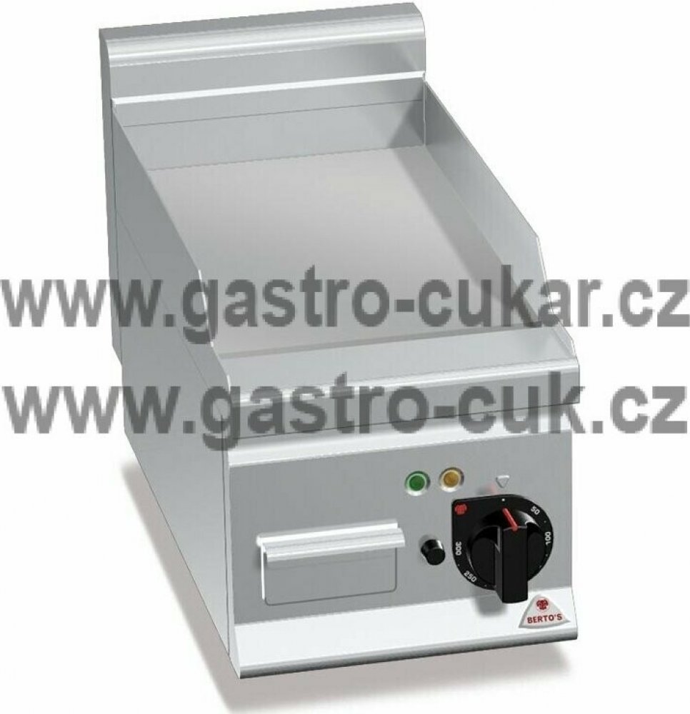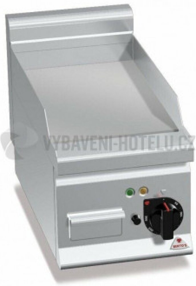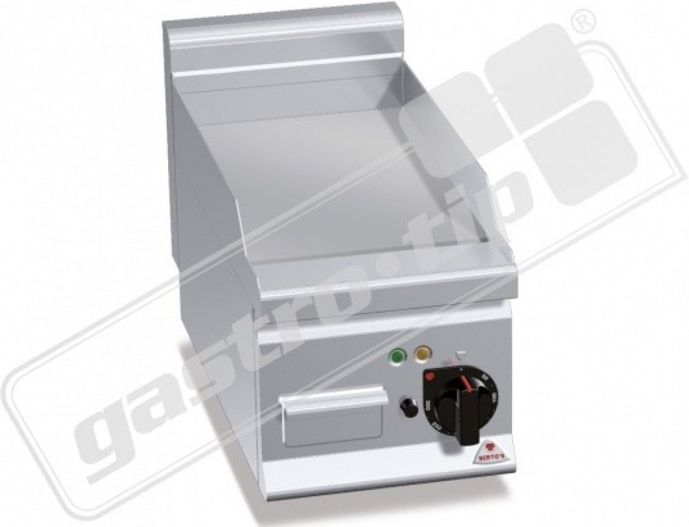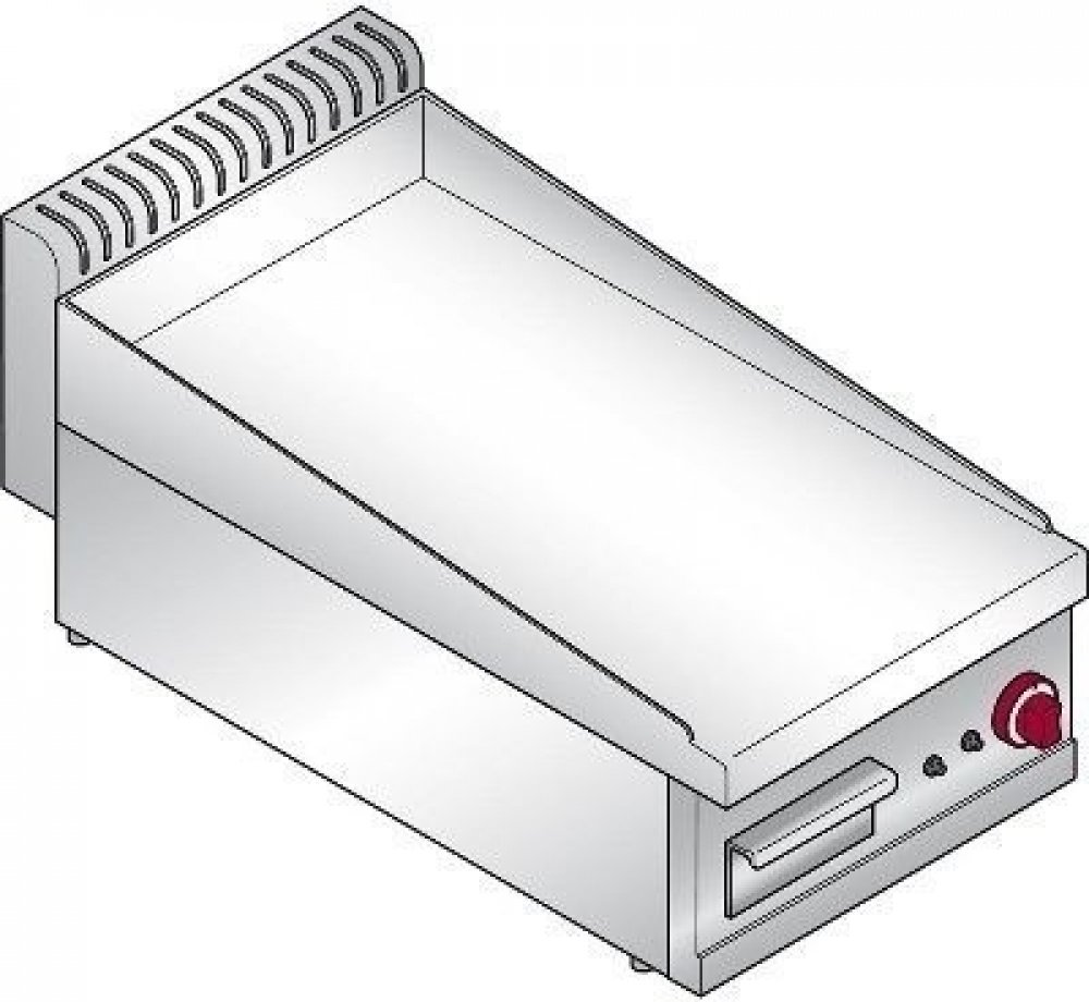 Elektrická grilovací deska. Topné těleso s vyšším výkonem je umístěno pod grilovací plotnou. Deska o velké tloušťce s hladkým (rýhovaným) povrchem z oceli a zvýšenými postranními lemy. Elektrická grilovací deska. Topné těleso s vyšším výkonem je umístěno pod grilovací plotnou. Deska o velké tloušťce s hladkým (rýhovaným) povrchem z oceli a zvýšenými postranními lemy.