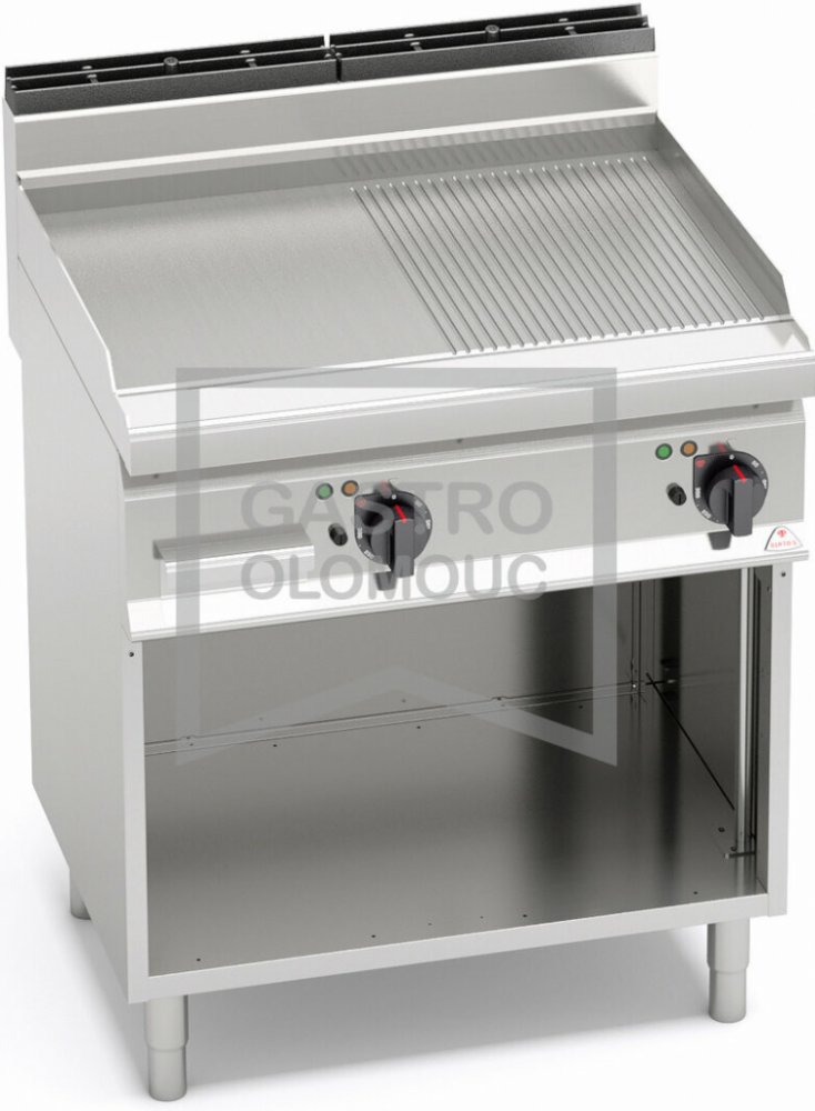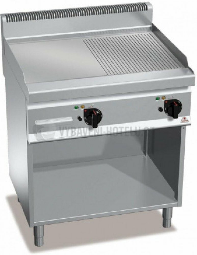 Zesílená grilovací deska s hladkým (rýhovaným) povrchem z oceli a zvýšenými postranními lemy. Topné těleso je umístěno pod grilovací plotnou. Dvě nezávislé zóny, regulační stupně umožňují nastavit teplotu 50-300°C. Kompaktní provedení s otevřeným podstavcem.