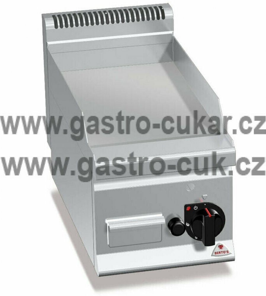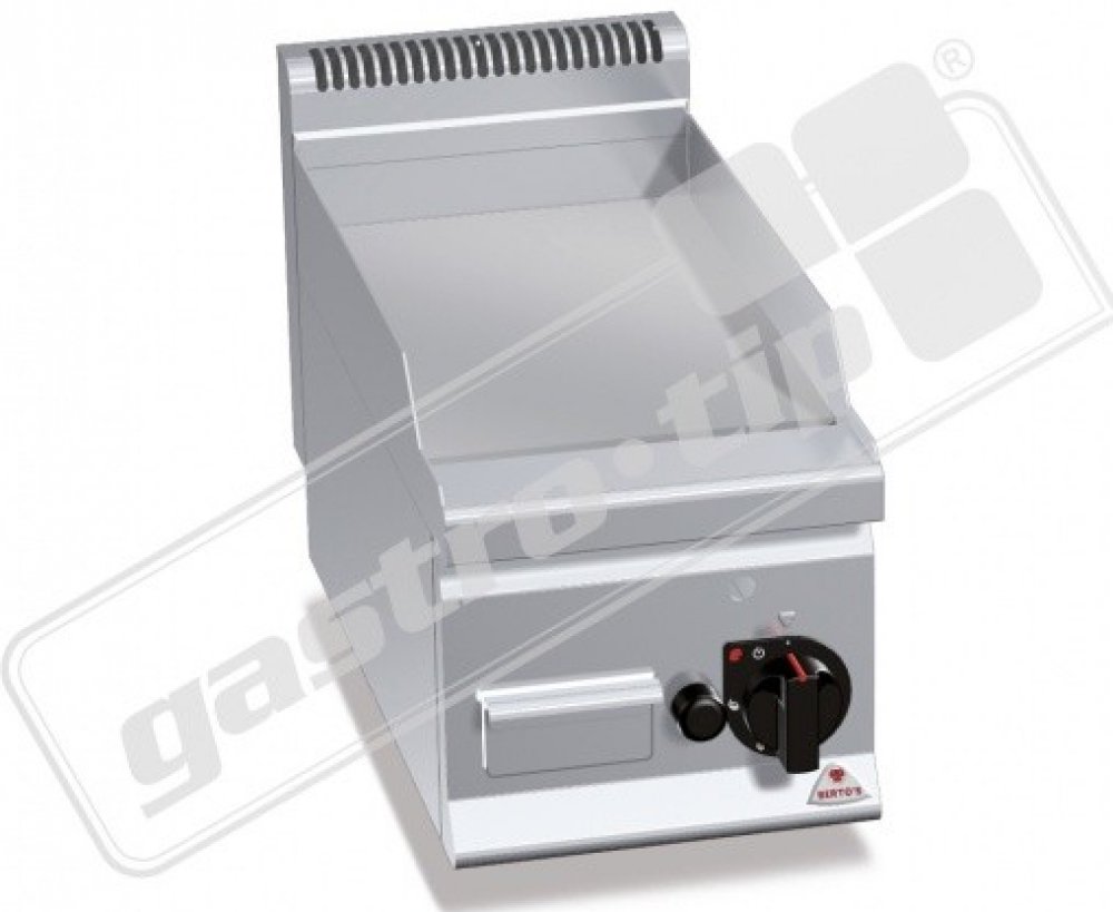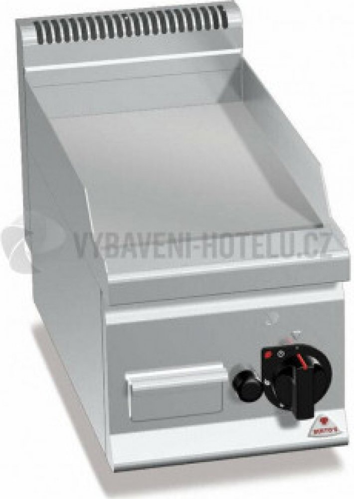 Termostatický ventil 30 až 300°C pro přesnou a bezpečnou regulaci. Termočlánek a chráněný zápalný plamínek. Deska hladká s vrstvou tvrdého chromu jež usnadňuje čistění, zvýšené postranní lemy. Kompletní sortiment plynových a elektrických ploten s různým provedením grilovací plochy. Lze na nich připravovat pokrmy tzv. "kontaktem" a to nejcitlivějším způsobem. Jenotný systém distribuce tepla zaručuje rovnoměrné grilování po celé pracovní ploše. Při grilování se přirozeně tvoří zbytkový olej, který je odváděn a shromažďován ve velké odpadní nádobce. Provedení: plyn Příkon: 4kW Povrch desky: chrom Rozměr plotny: 296 x 430 mm