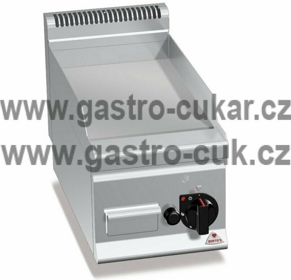 Termostatický ventil 30 až 300°C pro přesnou a bezpečnou regulaci. Termočlánek a chráněný zápalný plamínek. Deska s hladkým (rýhovaným) povrchem z oceli a zvýšenými postranními lemy.