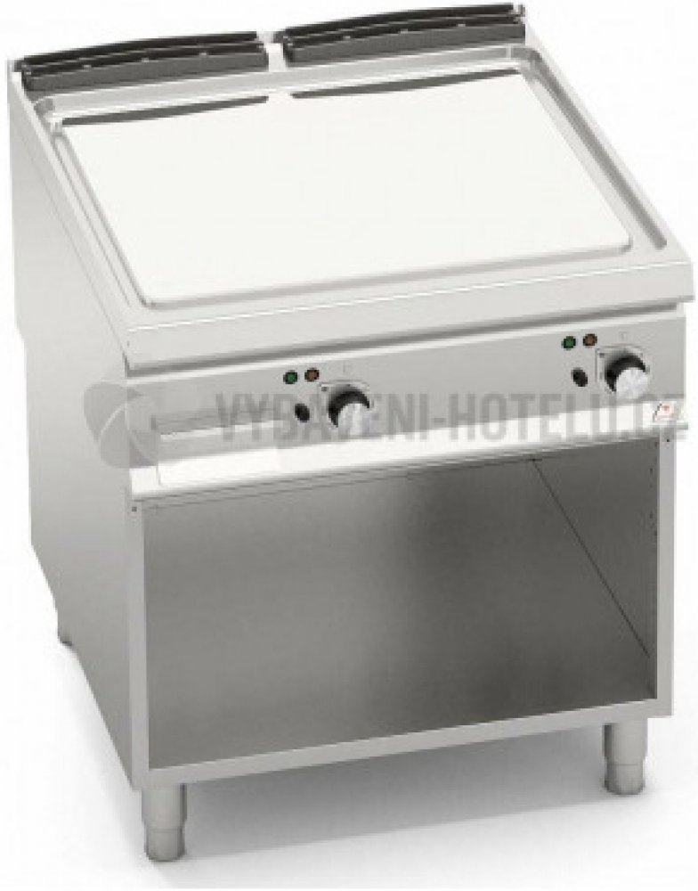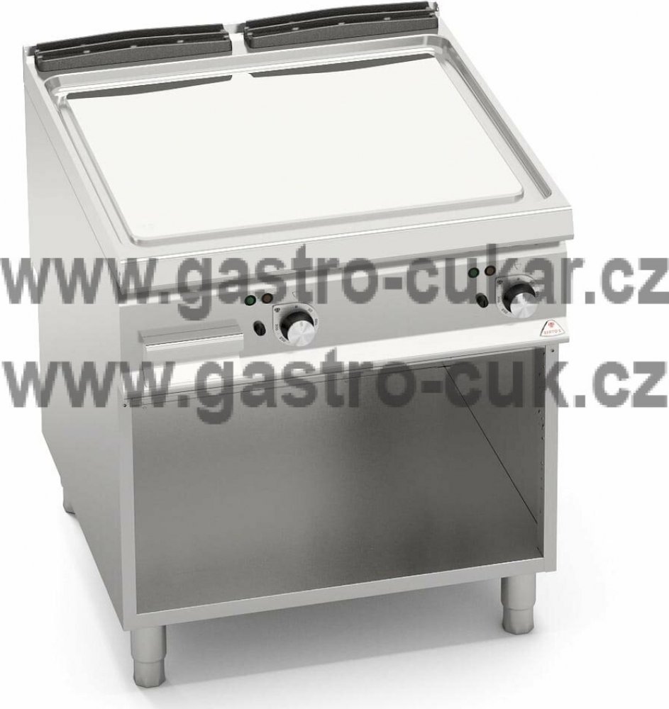Topné těleso z oceli Incoloy s obzvlášť velkým průměrem je umístěno pod grilovací plotnu. Dvě zóny s nezávislým ovládáním a přesnou regulací teploty. Dvojvrstvá grilovací plotna složená z ocelového plátu a horní vrstvy z nerez oceli AISI 316 s leštěným povrchem, který umožňuje snadné čištění. Nízká úroveň odlesku zvyšuje komfort při práci. Zvýšené postranní lemy. Kompaktní provedení s otevřeným podstavcem. Kompletní sortiment plynových a elektrických ploten s různým provedením grilovací plochy. Lze na nich připravovat pokrmy tzv. "kontaktem" a to nejcitlivějším způsobem. Jednotný systém distribuce tepla zaručuje rovnoměrné grilování po celé pracovní ploše, velké energetické úspory a zlepšení pracovního prostředí. Při grilování se přirozeně tvoří zbytkový olej, který je odváděn a shromažďován ve velké odpadní nádobce. Teflonová zátka, odolná vůči vysokým teplotám není součástí smažící plotny. Provedení: elektrika Povrch desky: leštěná ocel Rozměr plotny: 796 x 667 mm