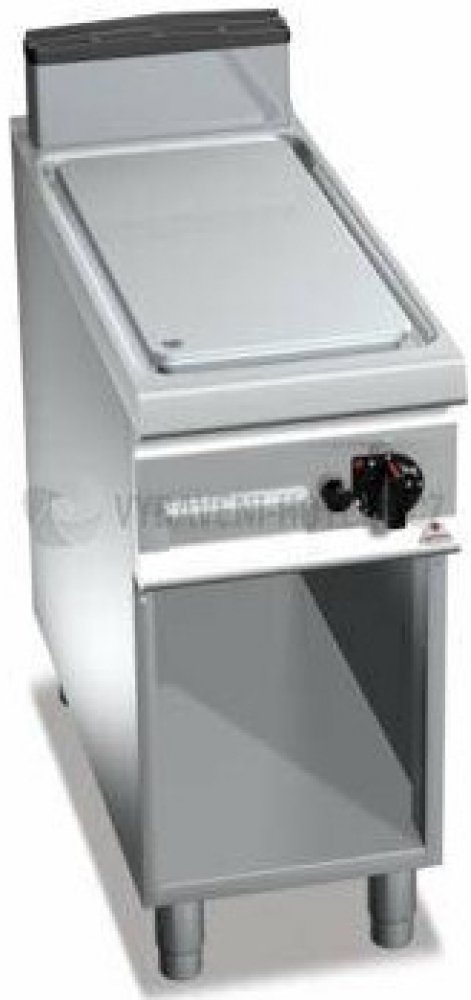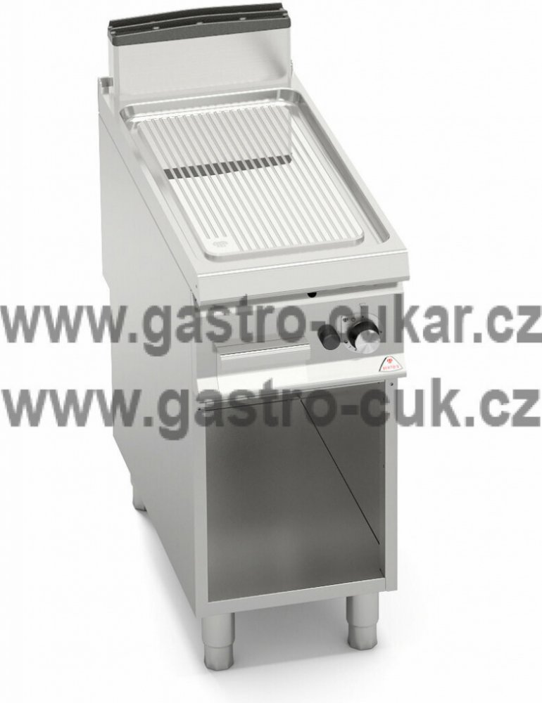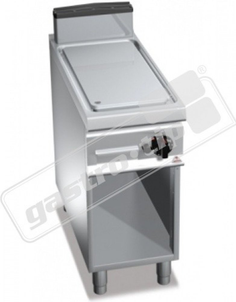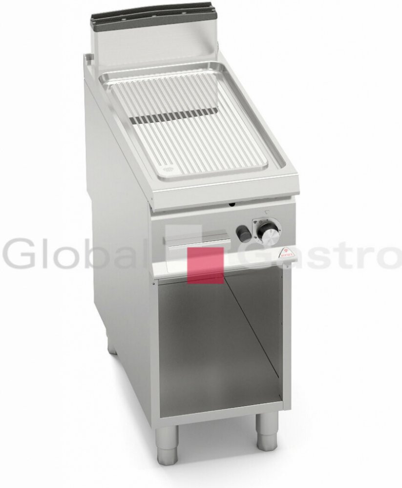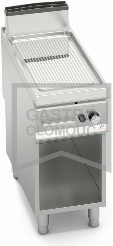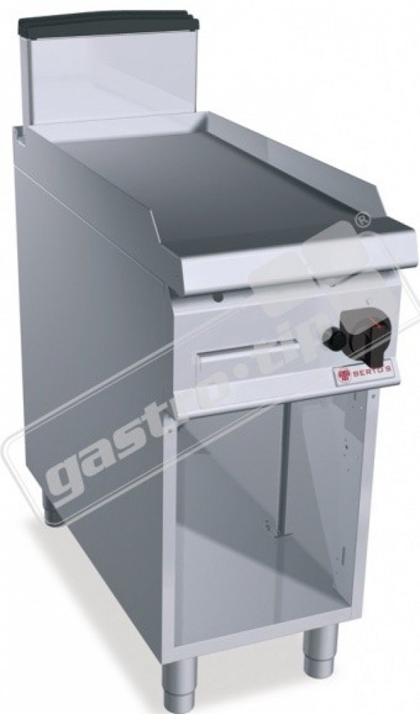 Termostatický ventil 30 až 300°C pro přesnou a bezpečnou regulaci. Termočlánek a chráněný zápalný plamínek. Dvojvrstvá grilovací plotna složená z ocelového plátu a horní vrstvy z nerez oceli AISI 316 s leštěným povrchem, který umožňuje snadné čištění. Nízká úroveň odlesku zvyšuje komfort při práci. Zvýšené postranní lemy. Kompaktní provedení s otevřeným podstavcem. Zvýšený odtah 120 mm není součástí ! Kompletní sortiment plynových a elektrických ploten s různým provedením grilovací plochy. Lze na nich připravovat pokrmy tzv. "kontaktem" a to nejcitlivějším způsobem. Jednotný systém distribuce tepla zaručuje rovnoměrné grilování po celé pracovní ploše, velké energetické úspory a zlepšení pracovního prostředí. Při grilování se přirozeně tvoří zbytkový olej, který je odváděn a shromažďován ve velké odpadní nádobce. Teflonová zátka, odolná vůči vysokým teplotám není součástí smažící plotny.