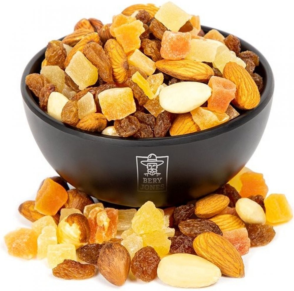 Směs ořechů a ovoce Bery Jones Milujete oříšky a sušené ovoce? Pak si tuto směs určitě zamilujete. Obsahuje ty nejkvalitnější ořechy a ovoce, dovážené ze zemí jejich původu. V jedné hrsti si můžete zároveň pochutnat na chutných mandlích, ať už loupaných nebo naturálních, na lískových oříšcích a také na kostkách papáji, na rozinkách a kostkách ananasu. Společně tvoří perfektní směs zdraví prospěšný...