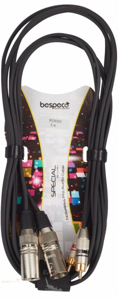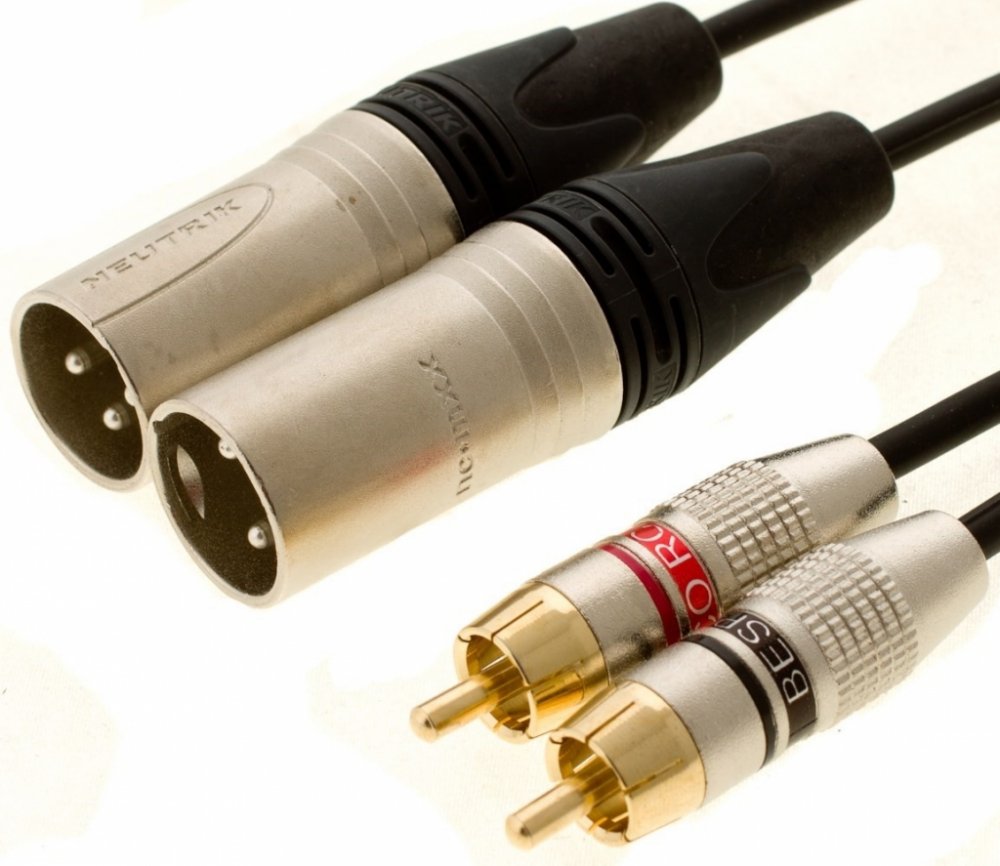 Audio kabel s dvěma RCA konektory a dvěma male (samec) konektory "Neutrik®". Stíněný kabel. Délka 3m.