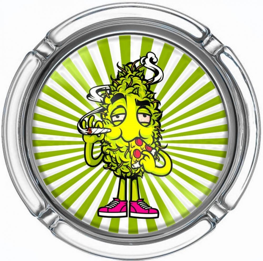 Skleněný popelník s designem bud, který jí kousek pizzy, zatímco v druhé ruce drží dlouhý doutník.