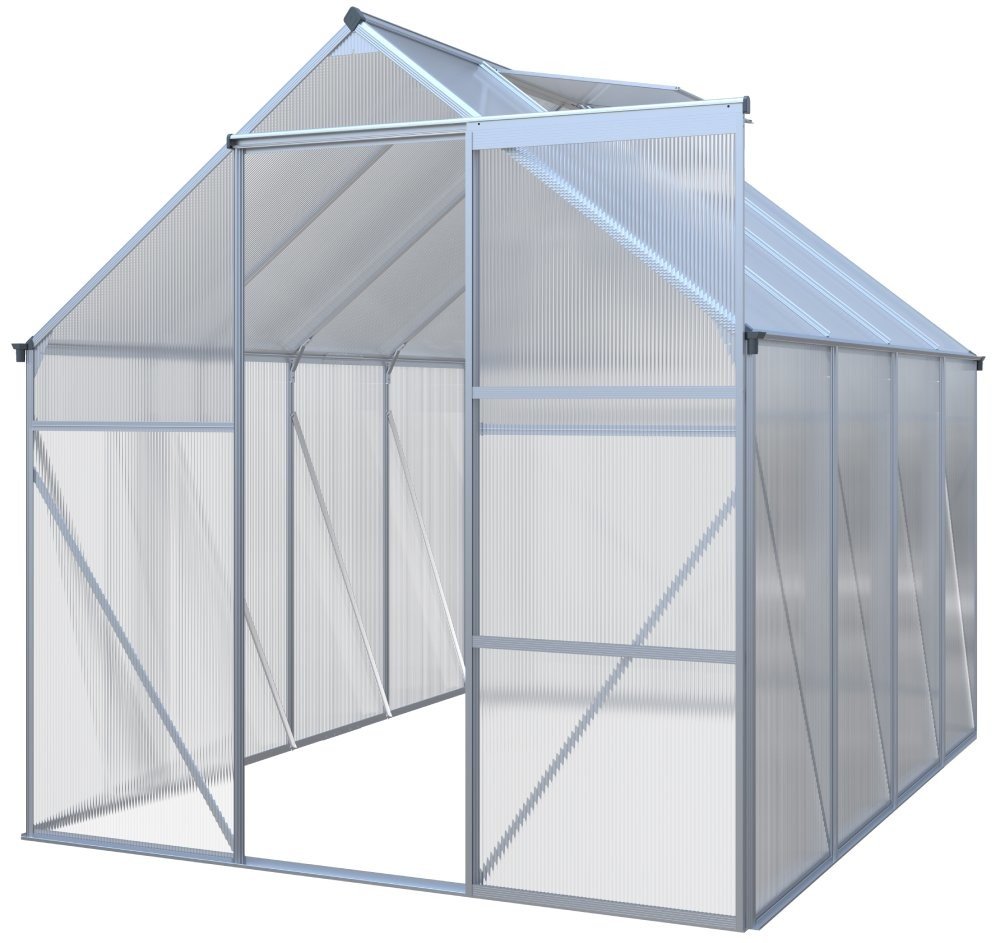 Skleník je vyroben z kvalitních materiálů, které jsou odolné vůči UV záření a korozivním vlivům. Sedlová střecha zabraňuje hromadění vody.