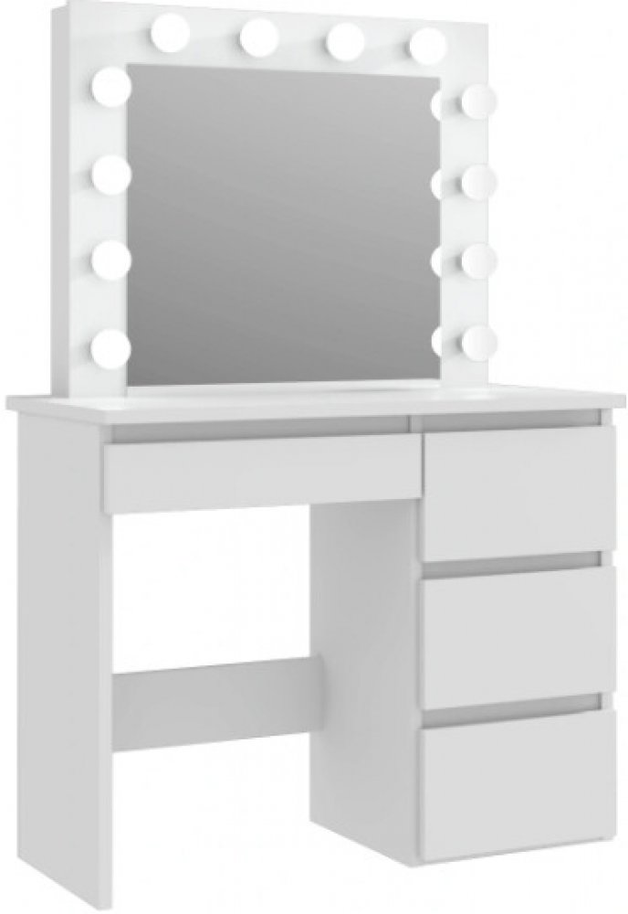 Toaletní stolek je vybaven velkým zrcadlem s LED osvětlením. Kolem zrcadla se nachází až 12 LED žárovek v neutrální barvě - nejlepší barva osvětlení pro vytvoření dokonalého make-upu. Zajistí tak ideální osvětlení vaší pokožky. Spínač světel je umístěn na boční straně zrcadla - je intuitivní použitelný a diskrétní skrytý. K stolku vede kabel dlouhý 180 cm. Sada obsahuje kromě žárovek také celou elektroinstalaci, která je certifikovaná CE.