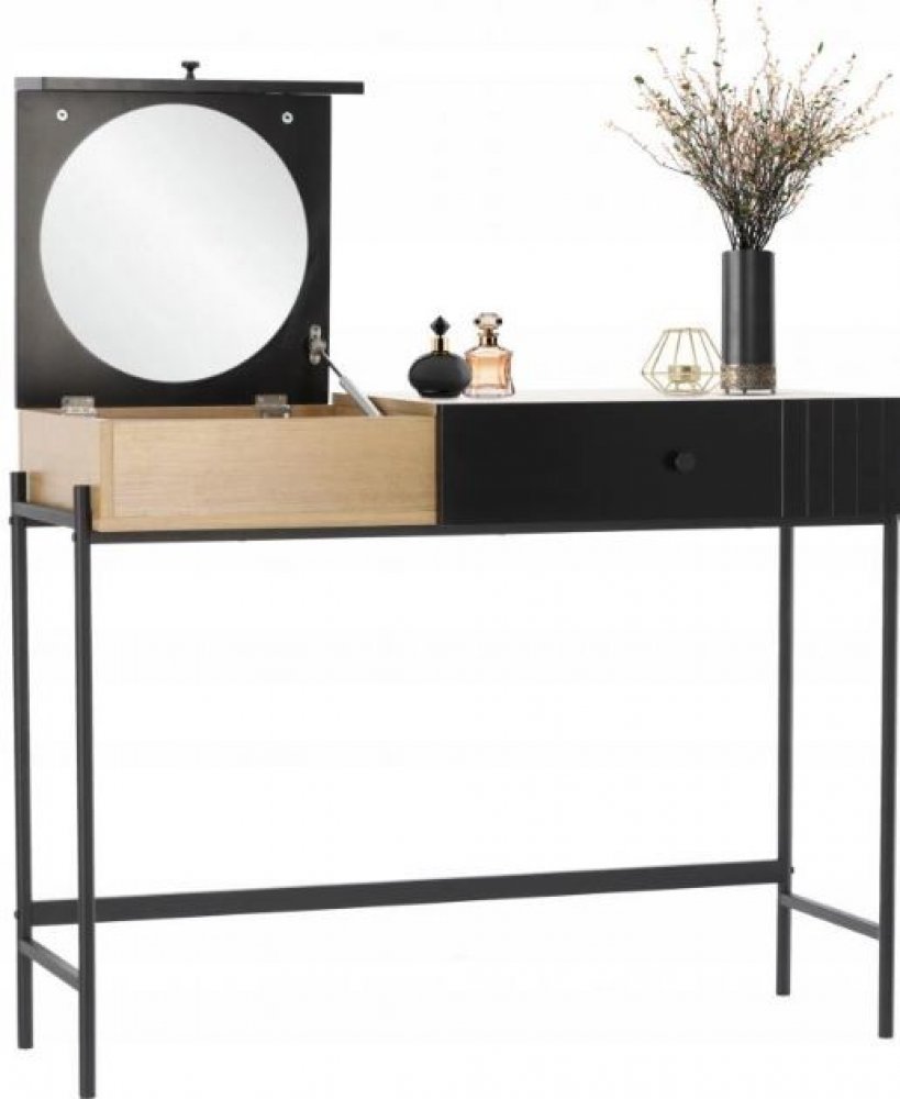 Toaletní stolek vyrobený z vysoce kvalitních materiálů, jako jsou dřevovláknitá deska (PB), melaminová deska, kov a sklo, zaručuje odolnost a estetiku. Kombinace černé a dřevěné povrchové úpravy dodává nábytku retro charakter, díky čemuž dokonale zapadne do různých stylů interiéru.
