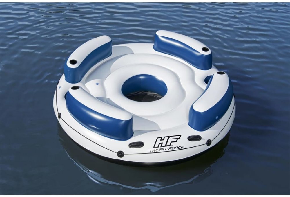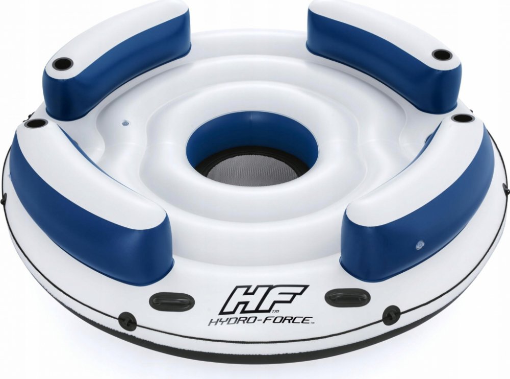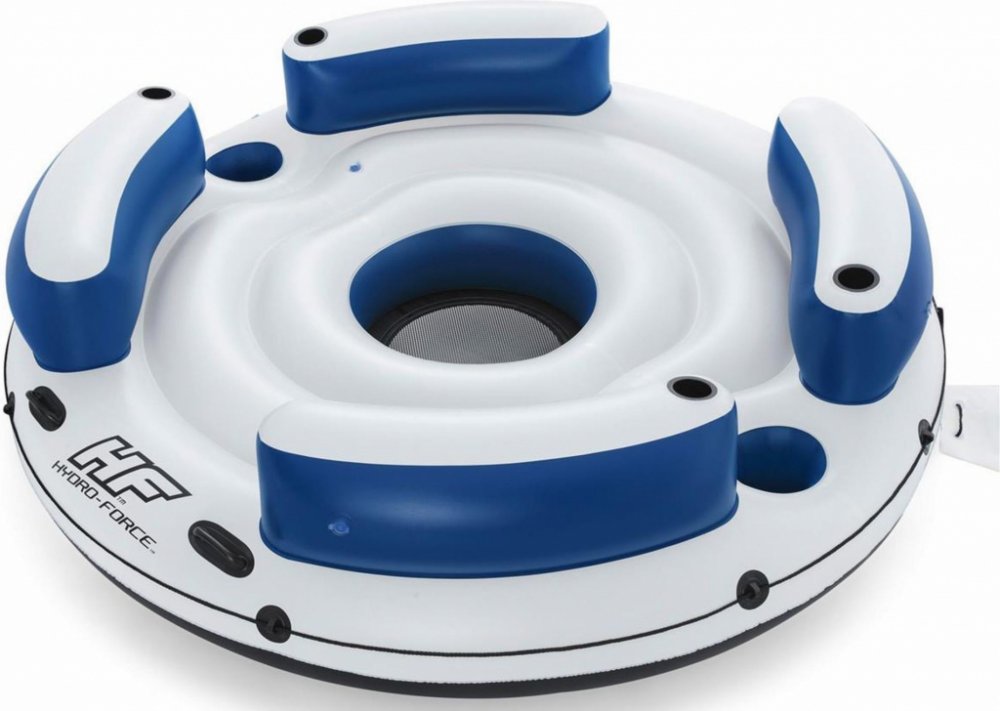 Odpočívejte a užívejte si sluníčka, zatímco se necháte unášet na vodě s tímto plovoucím ostrovem Hydro-Force od značky Bestway. Odolný materiál: Je vyrobený z PVC, takže je lehký, ale zároveň pevný a odolný. Použitý materiál odolává propíchnutí, drží tvar a má výbornou přilnavost. Rychlé nafouknutí: Rychloupínací ventily usnadňují nafukování a vyfukování. Pohodlné sezení: Vzhledem ke 4 extra širokým opěradlům a dostatku místa je tento ostrov opravdu pohodlný. Je také vybaven 4 držáky na nápoje a 2 vestavěnými úložnými přihrádkami, takže každá osoba má k dispozici pohodlné místo pro své oblíbené nápoje a občerstvení. Extra bezpečnost: Chladivé síťované dno a obvodové záchytné lano se zabudovanými poutky vám zajistí větší bezpečnost. Plovoucí ostrov je vybavený dvěma velmi odolnými úchyty pro přidržování, abyste na vodě udrželi stabilitu a rovnováhu. Barva: modrá a bílá Materiál: PVC (polyvinylchlorid) Rozměry: 239 x 63,5 cm (průměr x V) 4 extra široké polštářové opěrky zad 4 držáky na nápoje 2 vestavěné úložné prostory 2 velmi odolné úchyty Chladivé síťované dno Celoobvodové záchytné lano se zabudovanými průchodkami Propojené rychloupínací ventily Bestway číslo položky: 43536 Balení obsahuje: 1x plovoucí ostrov 1x kotevní taška 1 x záplata na opravu GPSR