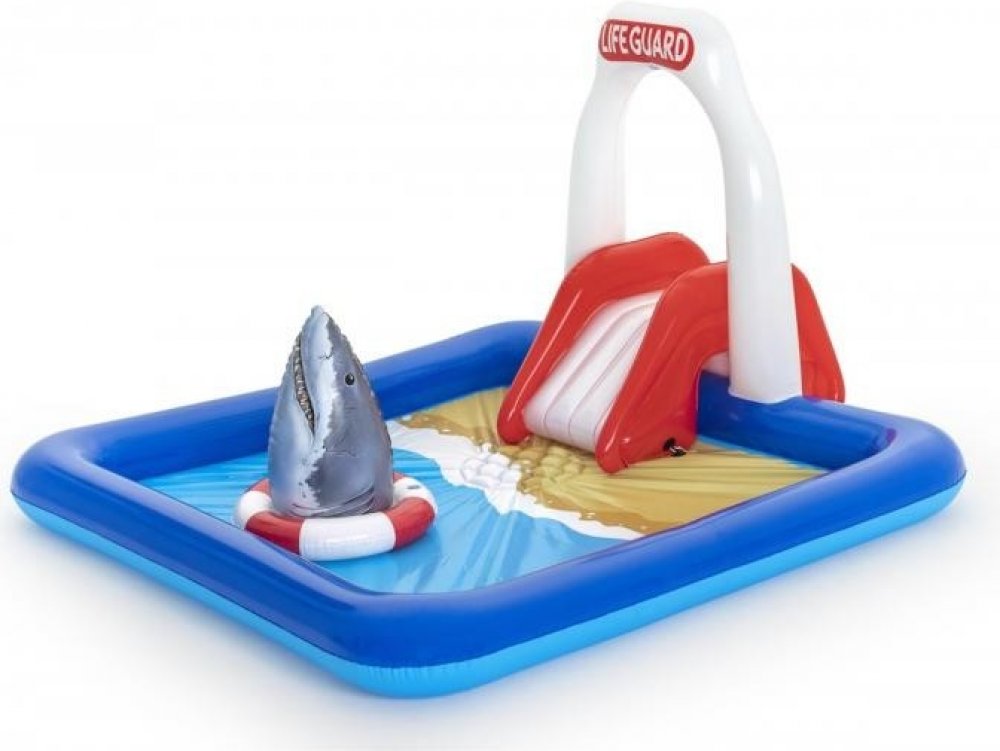 Nafukovací bazének se skluzavkou a sprchou Lifeguard Tower je dokonalým doplňkem každé zahrady. Připojením zahradní hadice spustíte postřikovač, který osvěží děti i vodu v bazénku. Součástí bazénku je odnímatelná skluzavka s nafukovací podložkou pro pohodlnější přistání. Žraločí hlava vznášející se na hladině lze použít uvnitř i vně bazénu. Vodu z bazénu vypustíte snadno pomocí vypouštěcího ventil...