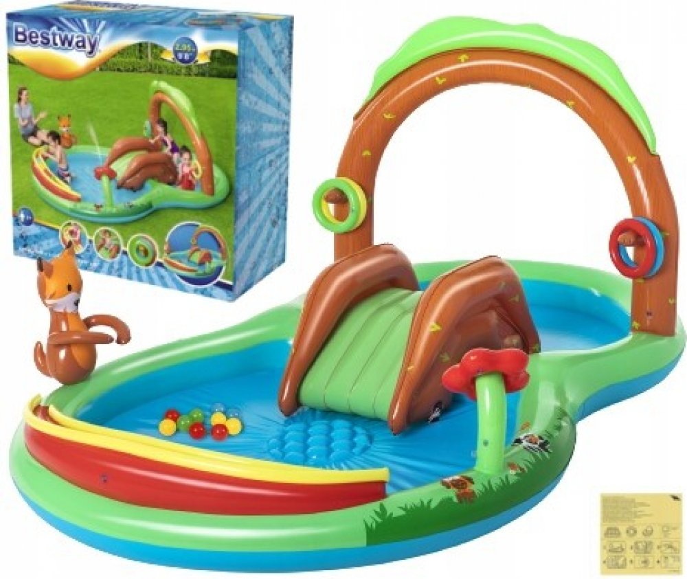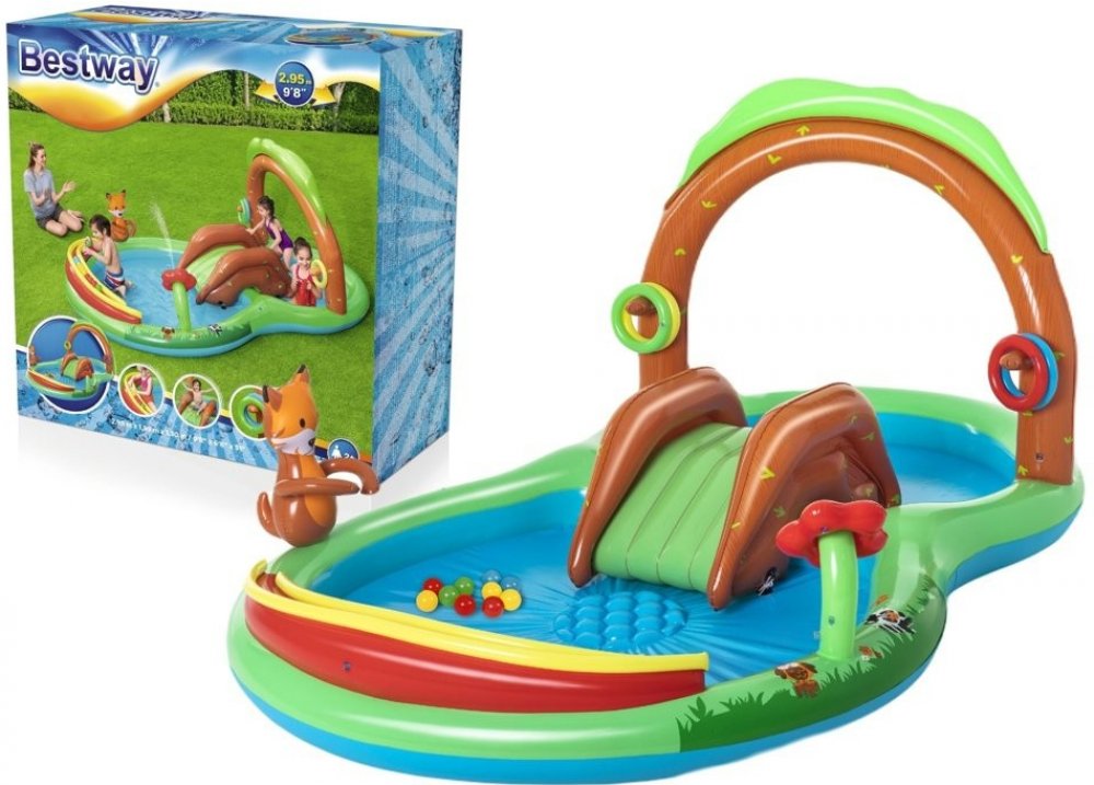 Není nic lepšího než si užít pohodu v lese! Vodní hřiště Bestway® Friendly Woods má mnoho prvků, které děti zabaví na dlouhé hodiny. Dvojité bazény jsou navzájem propojeny skluzavkou a květina funguje jako zabudovaný zavlažovač. Děti si mohou hrát v bludišti nebo házet do koše s liškou, případně mohou hrát šipky pomocí kolíků na kmenech stromů. Tyto hry jsou nejen zábavné, ale také procvičují koor...