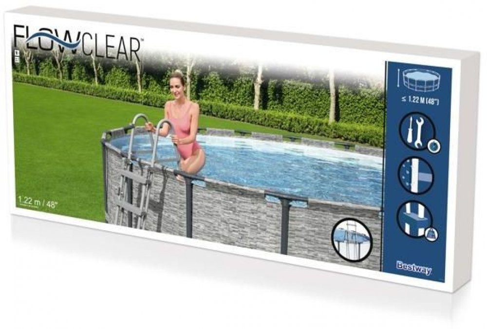Bezpečný kovový bazénový žebřík Bestway 122 cm je nezbytný pro vysoké zahradní bazény. Skládá se ze čtyř protiskluzových schůdků a plošiny. Protože je žebřík oboustranný, umožňuje pohodlný vstup a výstup z nádrže. Celá věc se velmi snadno sestavuje. Žebřík je vhodný pro výsuvné i stojanové bazény. Maximální rozměry stěny bazénu jsou 122 cm na výšku a 30 cm na šířku.