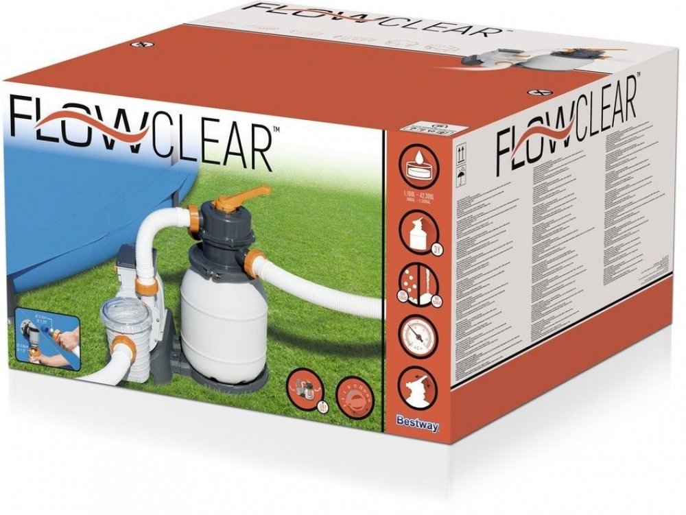 The Flowclear™ (5 678 l) písková filtrace je vysoce účinný a ekologický způsob, jak udržet čistou vodu v nadzemním bazénu. Je také mnohem nákladově efektivnější než provozování tradičního systému filtračního čerpadla, protože čerpadlo používá místo filtrační cartridge křemičitý písek. Tam, kde je třeba vyměnit filtrační cartridge každé 2 týdny, je třeba vyměnit křemenný písek pouze jednou za 3 roky. Písek zachytí menší nečistoty a úlomky a předfiltrový koš koše zase větší nečistoty, čerpadlo tak vydrží déle. Filtr je dodáván s dávkovačem ChemConnect ™, který udržuje čistou a nezávadnou vodu tím, že poskytuje stabilní hladinu chlóru rovnoměrně rozptýlenou po celém bazénu. Filtrace je vhodná pro nadzemní bazény o objemu 1 100 až 42 300 l. Jako filtrační náplň lze také použít filtrační kuličky Bestway Polysphere ™.