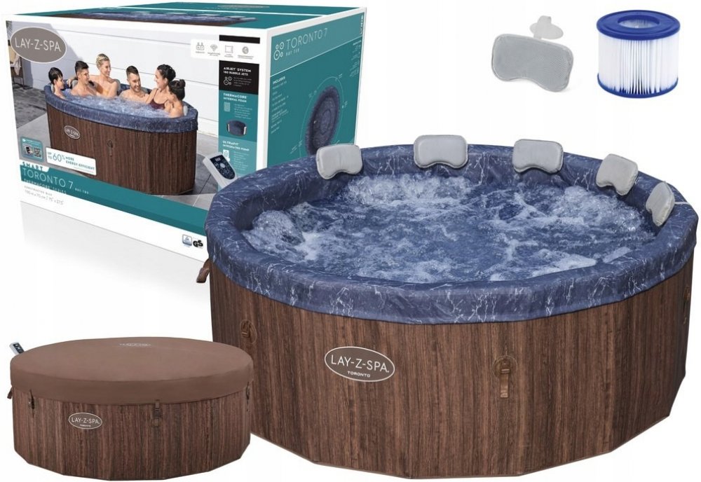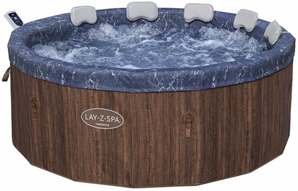 BESTWAY 6001W - Vířivka Lay-Z-Spa® Toronto AirJet™ s APP. Technické parametry: Rozměry: Ø 190 x 70 cm (vnitřní Ø 170 cm) Kapacita: až 7 osob Objem vody: 1.300 l Celková hmotnost s vodou: 1.340 kg Příkon: 2.050 W při 20 °C Ohřev: 1,1-1,6 °C/h (max. 40 °C) Konstrukce: ThermaCore™ pěnové panely Dvoudílný TriTech® potah se zipem 60%