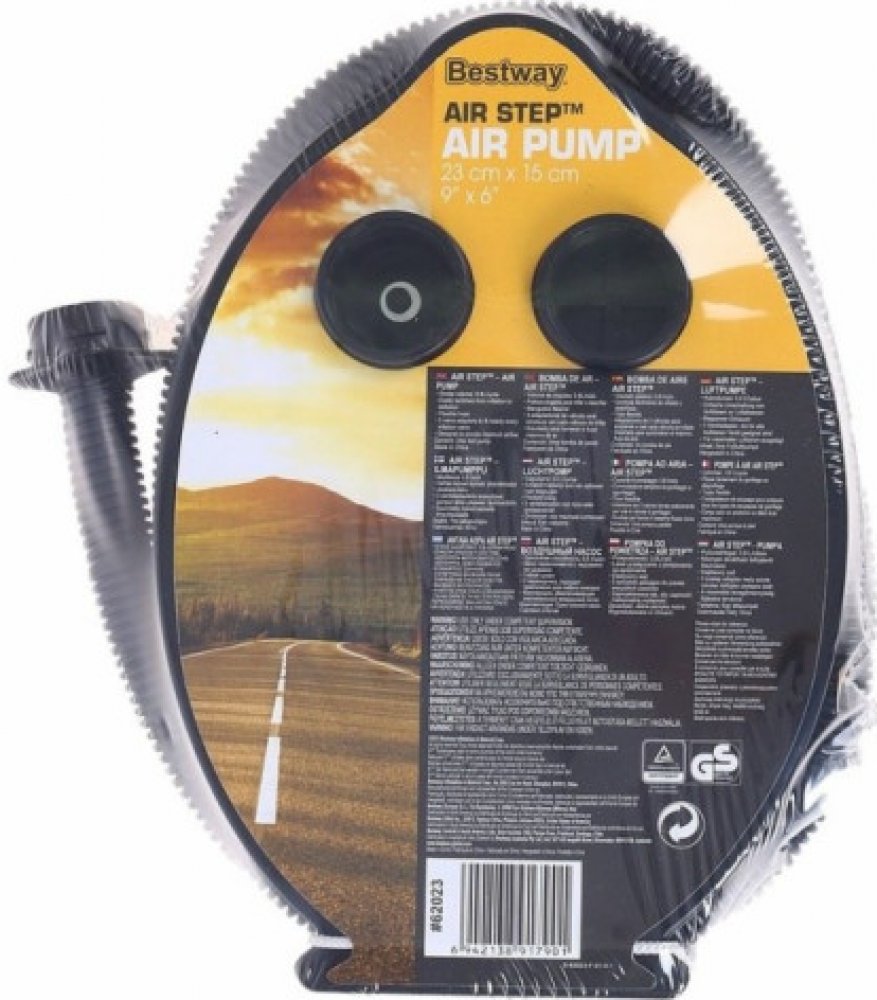 Vzduchová nožní pumpa Air Step Pro-Air nafukuje i vyfukuje míče, nafukovací čluny, bazény, hračky a další nafukovací předměty. Navržena tak, aby poskytovala maximální průtok vzduchu, dodává nepřetržitý proud při zdvihu nahoru i dolů. Snadno se přepíná z nafukování na vyfukování. Flexibilní hadice, včetně tří univerzálních adaptérů pasujících na každý nafukovací ventil. Odolná konstrukce, která garantuje dlouhou životnost.