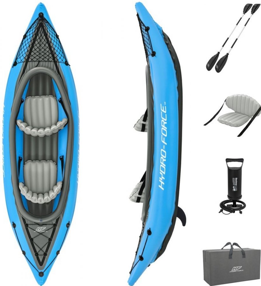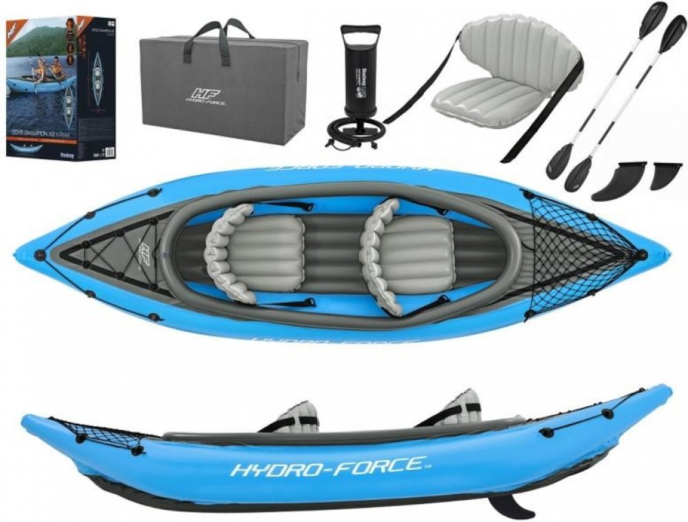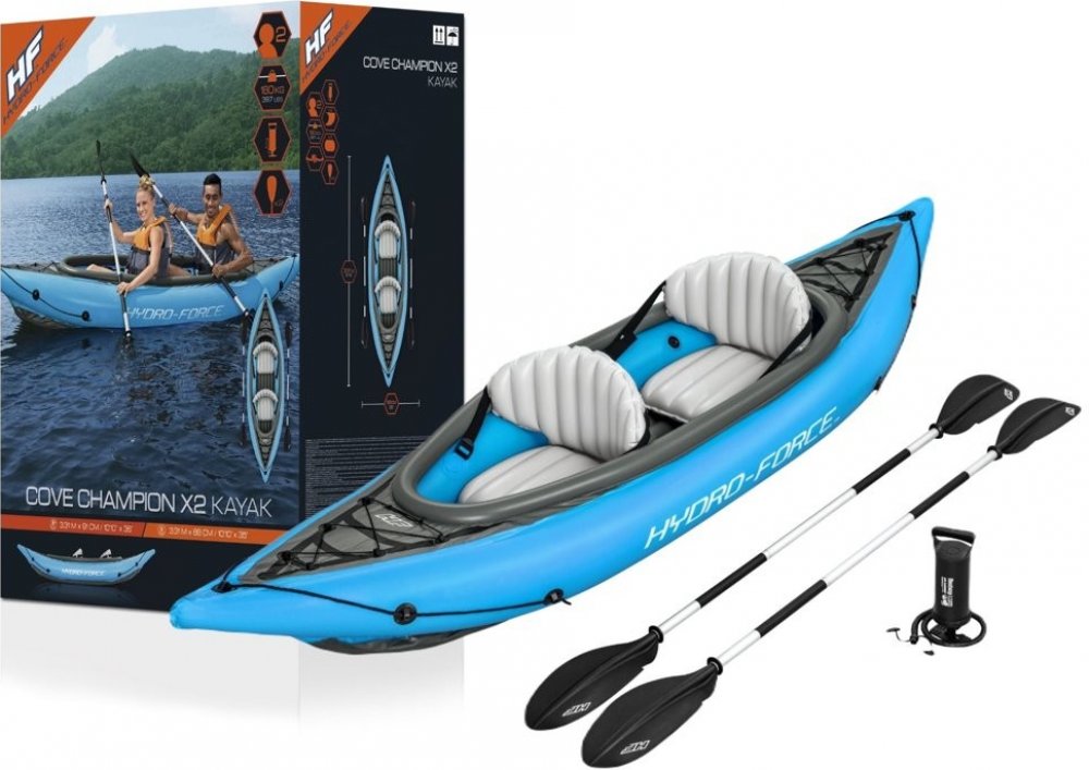 Prožijte léto na vyšší úrovni s nafukovacím kajakem Hydro-Force Cove Champion X2. Tento dvojmístný kajakový set obsahuje vše potřebné pro dokonalý den na vodě – 2 pádla, pumpu a sadu na opravy. Rychlé a jednoduché nafouknutí zajistí přiložená ruční pumpa Air Hammer. Pohodlný kokpit s 2 nafukovacími sedadly a opěrkami poskytuje dodatečné pohodlí. Kajak nabízí i dostatek prostoru pro uskladnění občerstvení, extra vybavení nebo dalších potřebných věcí na vodě. Má odnímatelné ploutve na spodní části pro snadnou manipulaci a kompaktní skladování. Transport nebo kotvení je snadný díky lanům na uchopení. Je snadný na použití a skladování. Objevte v sobě svého vnitřního objevitele s nafukovacím kajakem Hydro-Force Cove Champion X2.Technické údaje: