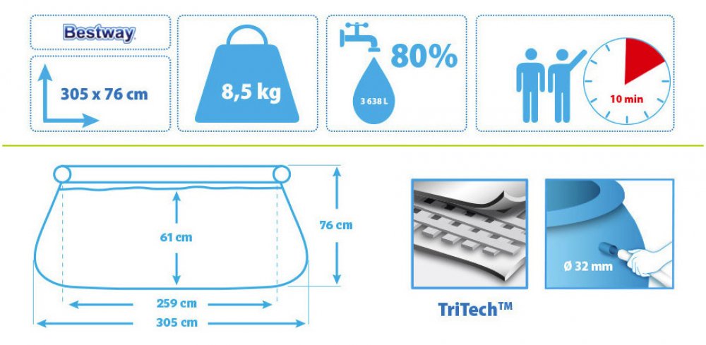 ⌀ 305 cm 76 cm 3800 l mnohoúhelníkové samonosné modré nadzemní Bestway třívrstvé PVC kartušová samostatný bazén