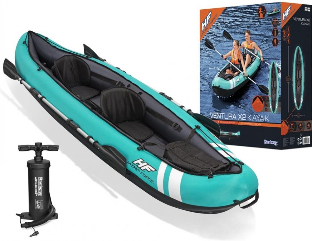 Výlet k vodě je ideální formou trávení volného času. Pro zpestření této bezstarostné chvíle se vybavte doplňkovým bazénovým příslušenstvím. Kajak se bude skvěle hodit i na rekreační výlet po jezeře nebo koupališti. Byl vyroben z odolného vinylu odolného proti poškození. Látka je odolná proti oleji, vodě a odolává intenzivnímu UV záření. Vysoce kvalitní nylonová skořepina je také odolná proti propíchnutí a postavena tak, aby vydržela drsné a často kamenité říční vody. Budete moci manévrovat klikatými řekami, jezery, klidnými otevřenými vodami nebo přílivem a přílivem vln. Navrženo s nastavitelnými opěradly pro pohodlí a podporu. Kromě úložného prostoru umístěného v konstrukci plavidla je zde také odnímatelná úložná taška, která vám umožní mít přístup k vašim nezbytnostem při pádlování ve vodě. Pádla s dvojitou čepelí jsou hliníková, lehká a rovnoměrně držená pomocí bezpečných západek. Při plném nafouknutí ruční pumpou je kajak dlouhý 2,80 m a unese až 200 kg. Na každé straně má pevná plátěná madla, díky kterým je přenášení kajaku dětskou hrou. Kajak má odnímatelné ploutve, které pomáhají udržovat směrovou stabilitu a zvyšují rychlost. Pro uskladnění jednoduše oddělte ploutve od kajaku a získáte ultrakompaktní, prostor šetřící komponent.