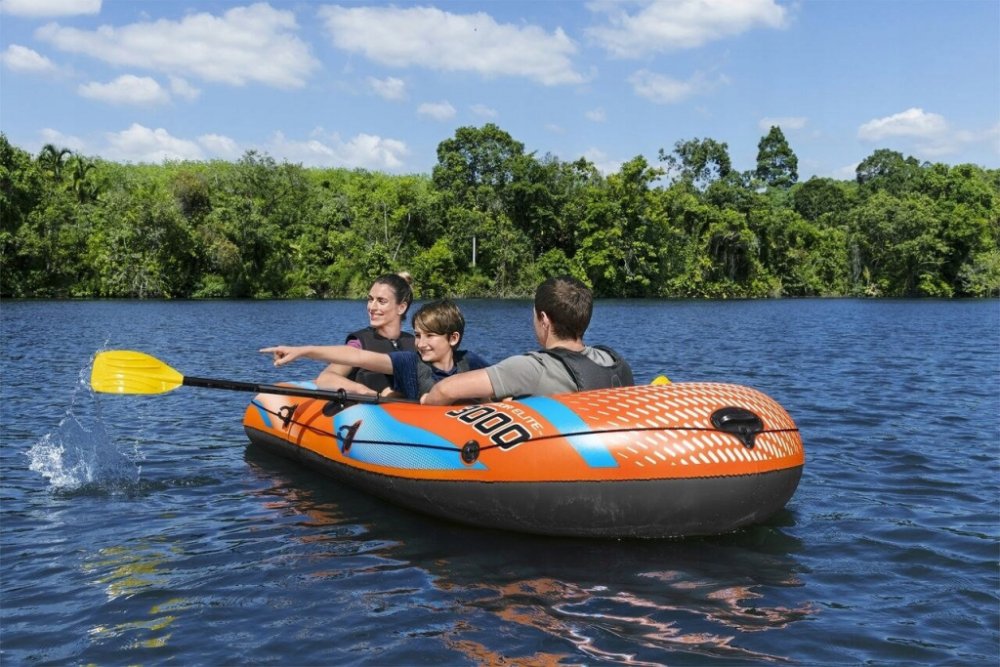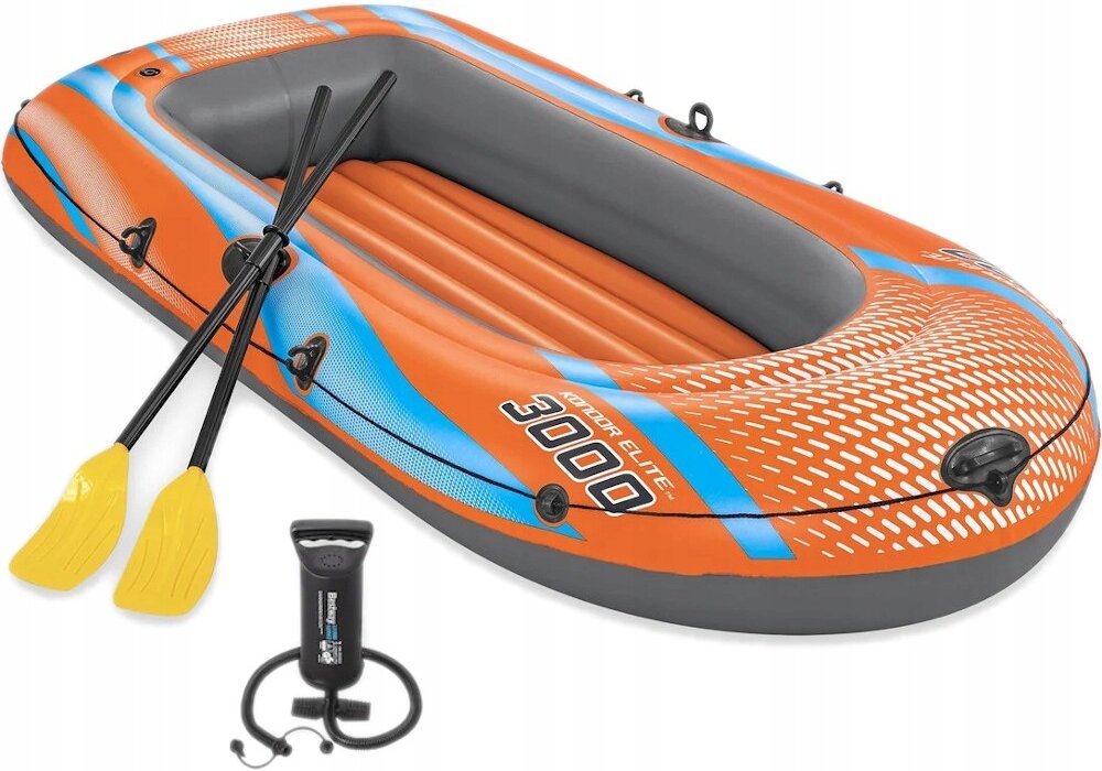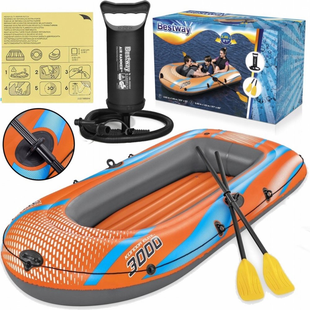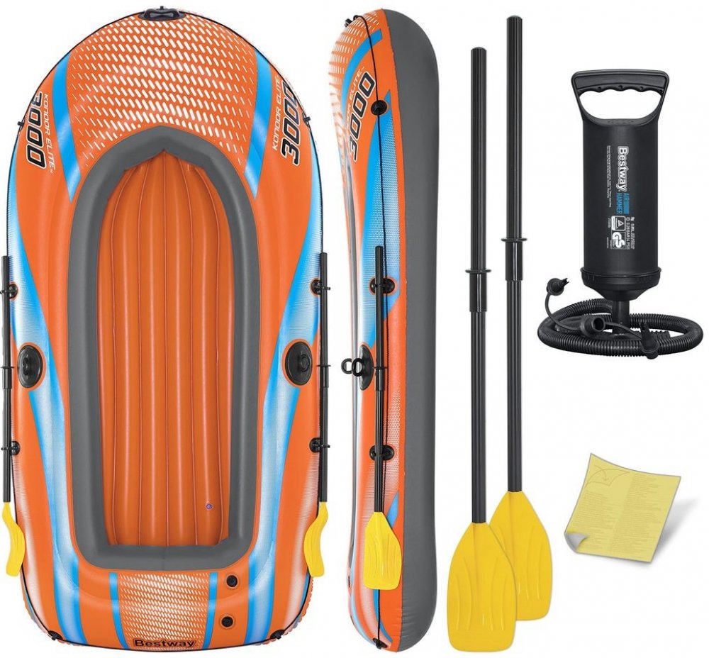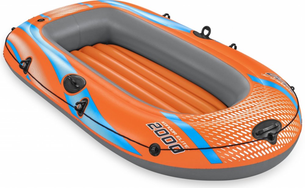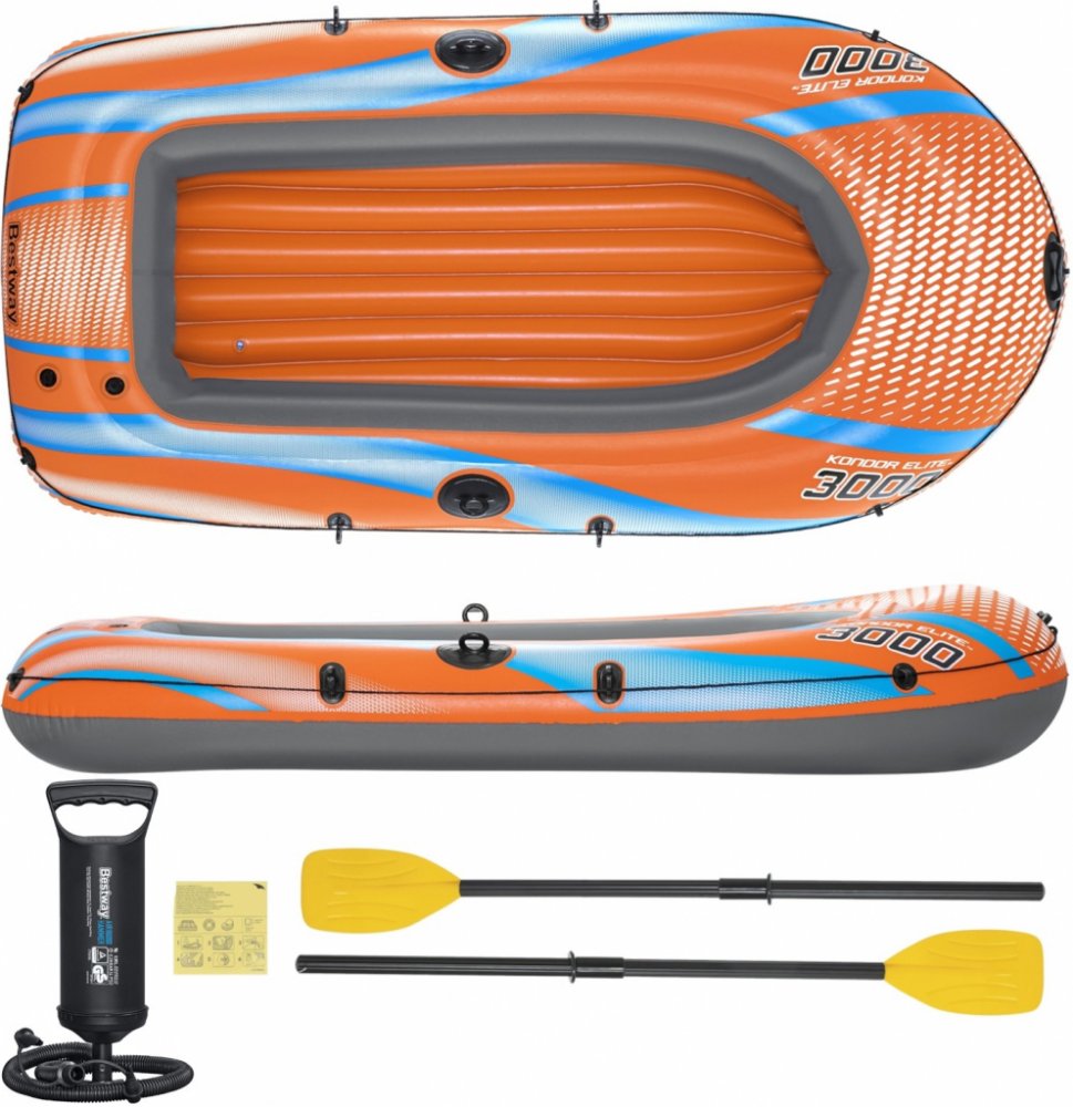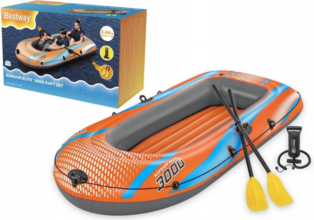 Nafukovací člun Bestway KONDOR 3000 RAFT SET je vyroben z trvanlivého PVC. Bezpečnost zvyšuje tříkomorová konstrukce a ventily zamezující rychlému vypouštění. Nafukovací dno zvyšuje pohodlí při sezení. S tímto člunem můžete objevovat krásu tajuplných zátok a zažít spoustu dobrodružství.
