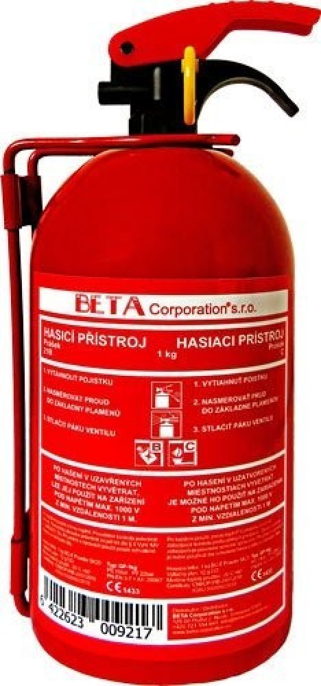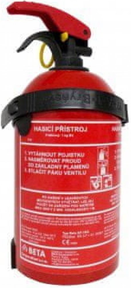 Tento práškový hasicí přístroj 1kg je vhodný k hašení požáru v počáteční fázi. Používá se především jako vybavení do osobních automobilů, ale najde si své využití také v domácnostech. Je vhodný i pro jiné dopravní prostředky, obchod, průmysl, archívy a všude, kde nesmí dojít k poškození elektrického zařízení vodou nebo pěnou. Hasicí přístroj tohoto typu je zvláště vhodný tam, kde je požadován malý a skladný univerzální hasicí přístroj, umožňující rychlou a efektivní likvidaci případného zahoření. Práškový hasicí přístroj má plastový ventil a plastový držák a díky tomu je jeho celková hmotnost nízká a to pouze 1,5kg. Lze jej použít i k hašení elektrických zařízení pod napětím do 1000 V z minimální vzdálenosti 1 m.Hasicí přístroj je bez manometru a po použití je znovu naplnitelný. Jeho ergonomicky tvarovaný ventil umožňuje snadné a bezpečné uchopení a ovládání s bezpečnou manipulací. Ventil tvoří spolu s bezešvou nádobou kompaktní a vyvážený celek. Přístroj je vyroben v souladu s evropskými normami a certifikován dle normy EN3.