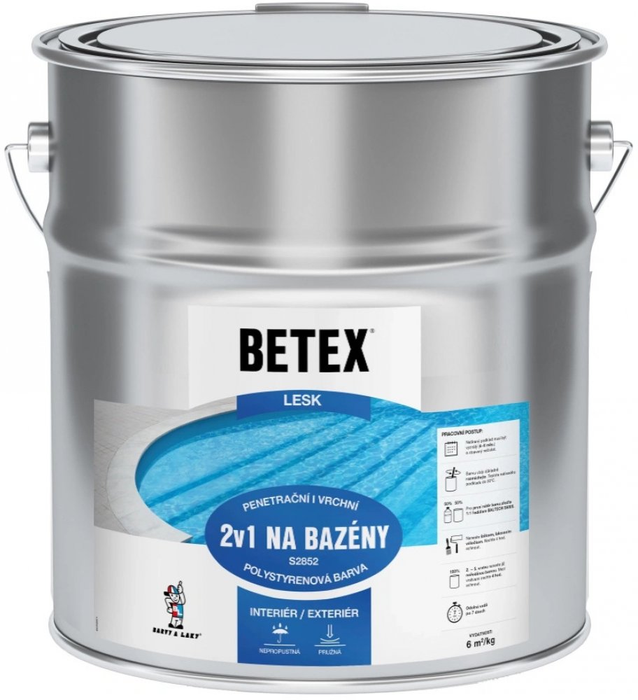 Nátěry omítky, zdiva, betonu: Povrch musí být dokonale vyzrálý, zdrsněný, soudržný a pečlivě očištěn od špatně ulpívajících částic (nesmí být gletovaný). 1. Penetrace - email S 2852 zředěný ředidlem S 6005 v poměru 1 : 1 2. 3 - 5x email S 2852 BETEX 2v1 NA BAZÉNY Nátěr kovu: 1. 1x barva syntetická základní S 2003 FORMEX Vrchní nátěr se nanáší do 24 h nebo až po 7 dnech. 2. 3 - 4x email S 2852 BETEX 2v1 NA BAZÉNY (interval nanášení 4 h/23