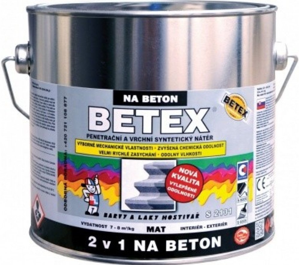 Podrobnosti o produktu BL 1346-065132 2 kg Tento univerzální nátěr je ideální pro ochranu a úpravu betonových a minerálních povrchů, jako jsou podlahy sklepů, garáží, terasy, balkóny, zídky a sloupky. BETEX 2v1 NA BETON se vyznačuje vynikající odolností proti povětrnostním vlivům, mechanickému opotřebení a poskytuje krátkodobou ochranu před vybranými chemikáliemi (např. nafta, motorový olej, kysel...