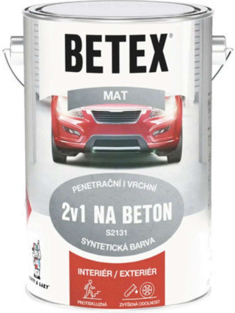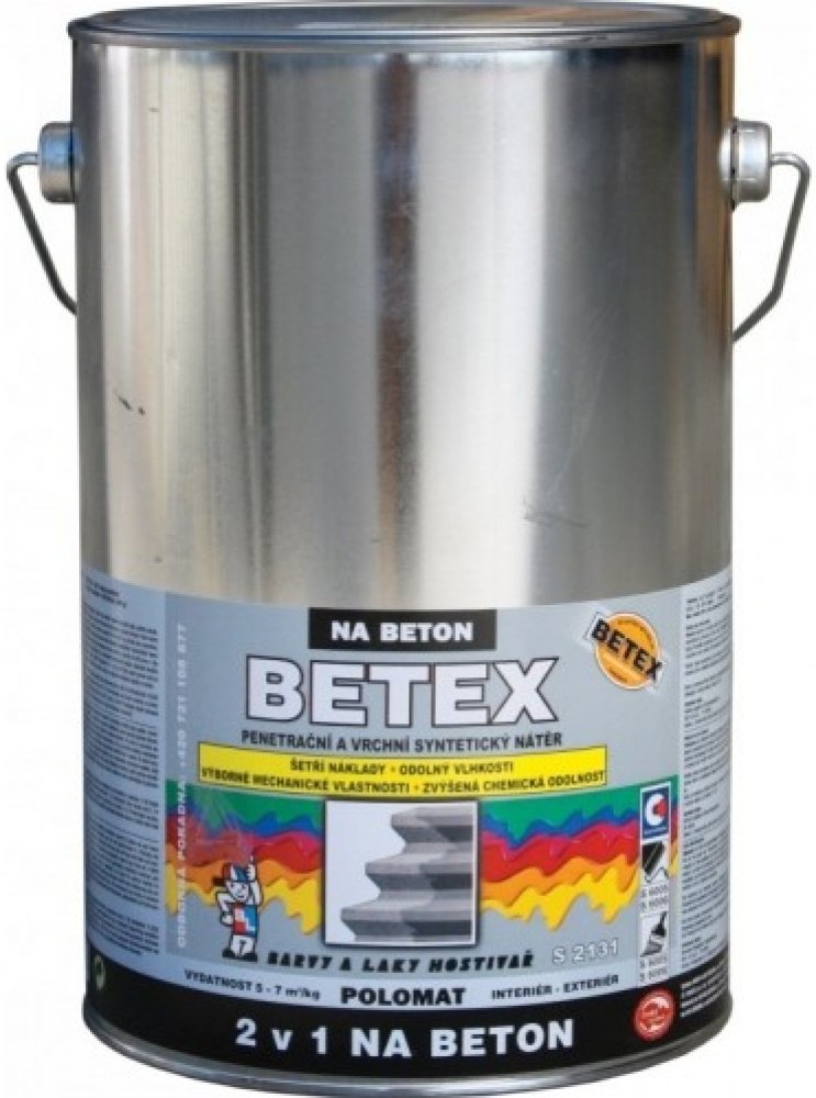 Podrobnosti o produktu BL 1346-065164 5 kg Tento univerzální nátěr je ideální pro ochranu a úpravu betonových a minerálních povrchů, jako jsou podlahy sklepů, garáží, terasy, balkóny, zídky a sloupky. BETEX 2v1 NA BETON se vyznačuje vynikající odolností proti povětrnostním vlivům, mechanickému opotřebení a poskytuje krátkodobou ochranu před vybranými chemikáliemi (např. nafta, motorový olej, kysel...