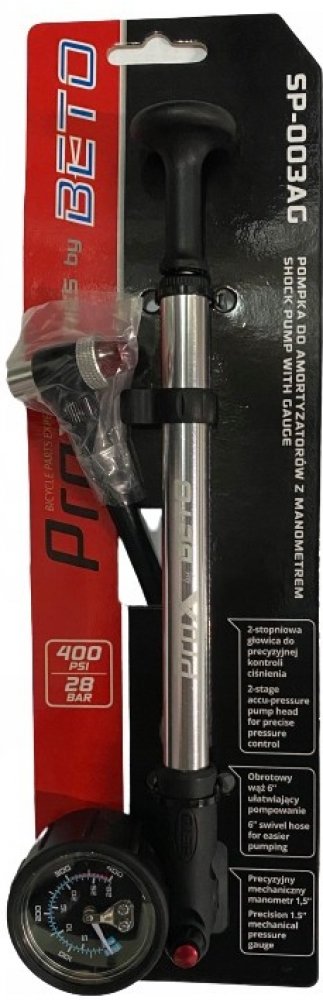 BETO SP-003AG Pumpička na pumpování tlaku odpružených vidlic a zadních tlumičů - ventil uvolňující tlak pro výbornou regulaci - flexibilní hadice - s přesným manometrem na konci hustilky - hustilka má Alu tělo - madlo je z kratonu - Max. tlak 300 PSI/ 20 BAR - s ventilem zabraňujícím úniku tlaku po nahuštění Návod : 1, nejprve na hustilce povolte ( drobně vyšroubujte) červené kolečko na koncovce h...