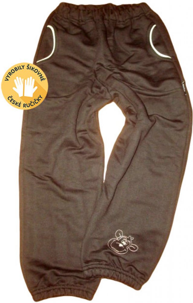Jedinečná kolekce ušitá pouze pro náš e-shop. Složení: 100% bavlna bez chloupku Dole volné (bez gumy). V nabídce máme i tepláky dole do gumy. Krásné tepláky z velmi kvalitní bavlny od českého výrobce. Tepláky necháváme šít již spoustu let u české firmy Betty Mode. Jedná se o kvalitní českou výrobu. Jsou šité s maximální pečlivostí. Obrázek je vyšitý. Kvalita je kontrolována u každého kusu. Každým rokem se pro tyto tepláky vrací čím dál víc maminek. Původně jsme je nechávali šít do vel. 128, postupně - jak nám zákazníci rostou jsme již na velikosti 152 (tyto větší velikosti šijeme bez výšivky). Vnitřní strana smyčka bez chloupku. Tento materiál tepláků je nejvyhledávanější našimi zákazníky. Nejsou silné a dají se nosit od jara do podzimu, nebo do školky. V pase do gumy. Z vnitřní strany obšitá dírka (možnost regulace či výměna gumy). 2 olemované kapsičky. Počítejte se srážlivostí 2 cm na délku po vyprání. rozměry: velikost 92-116: cena 179,- Kč: vel. 92: Délka 51 cm, vnitřní délka nohavice 34 cm. Pas v klidu 42 cm, natažený 68 cm. vel. 98: Délka 57 cm, vnitřní délka nohavice 37 cm. Pas v klidu 42 cm, natažený 70 cm. vel. 104: Délka 62 cm, vnitřní délka nohavice 41 cm. Pas v klidu 46 cm, natažený 73 cm. vel. 110: Délka 68 cm, vnitřní délka nohavice 45 cm. Pas v klidu 48 cm, natažený 76 cm. vel. 116: Délka 70 cm, vnitřní délka nohavice 49 cm. Pas v klidu 46 cm, natažený 73 cm. velikost 122-140: cena 215,- Kč: vel. 122: Délka 74 cm, vnitřní délka nohavice 51 cm. Pas v klidu 48 cm, natažený 76 cm. vel. 128: Délka 77 cm, vnitřní délka nohavice 54 cm. Pas v klidu 50 cm, natažený 80 cm. vel. 134: Délka 79 cm, vnitřní délka nohavice 57 cm. Pas v klidu 50 cm, natažený 86 cm. vel. 140: Délka 86 cm, vnitřní délka nohavice 61 cm. Pas v klidu 51 cm, natažený 86 cm.