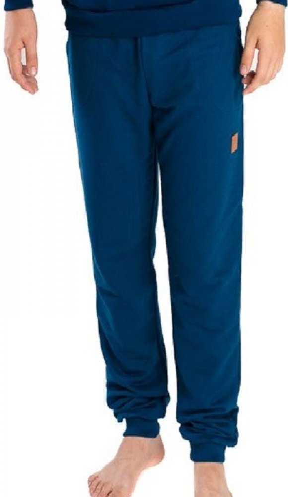 Pánské tepláky ukončené pružnou manžetou, ozdobené logem. Pánské tepláky na doma. Uštio na Moravě. Součástí tepláků jsou šňůrky, pomocí kterých se dá regulovat velikost pasu v případě potřeby. Pas je ukončen pružným lemem. Tepláky mají dvě přední kapsy. Model má pohodlný střih a je vhodný pro každodenní nošení.Materiál: 100% bavlnaVýrobce: Betty Mode