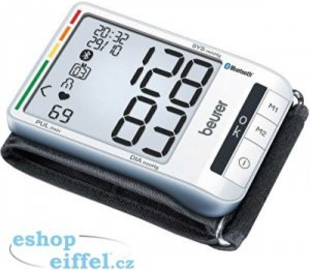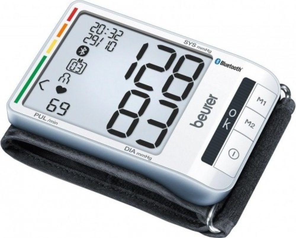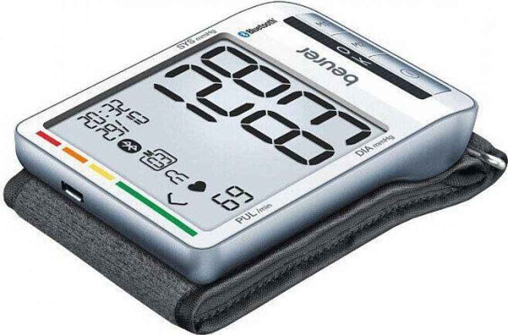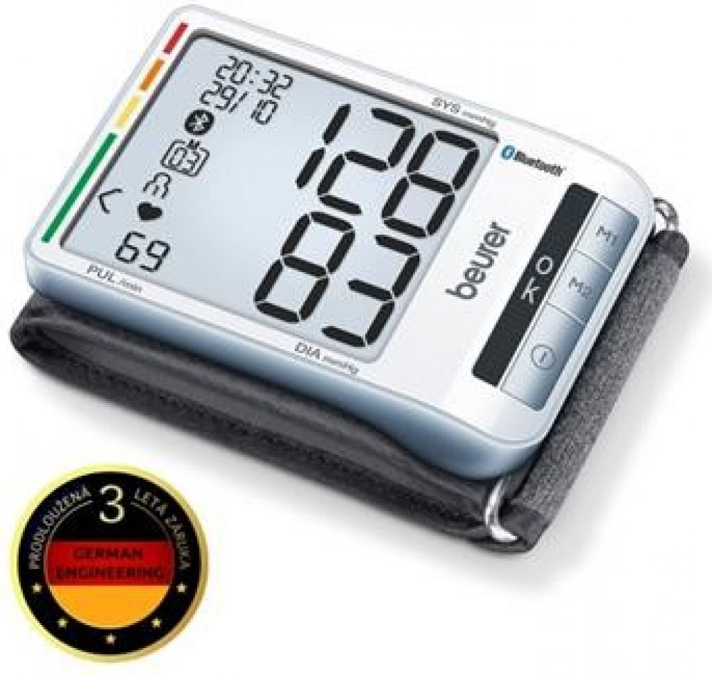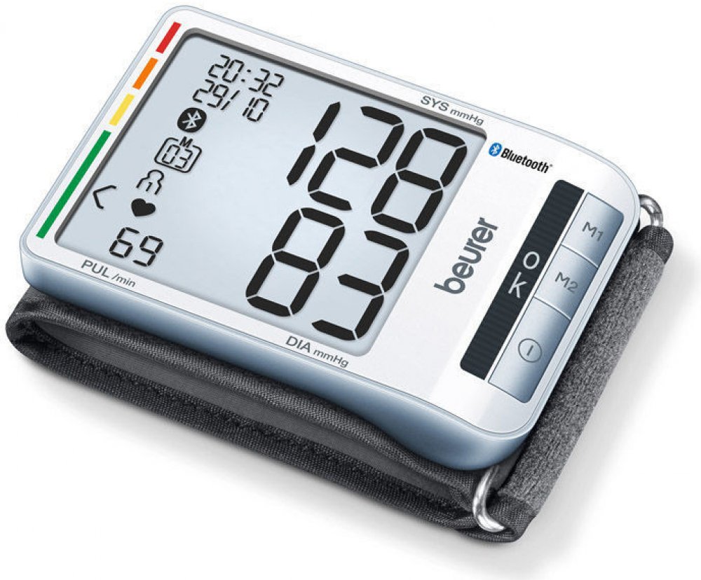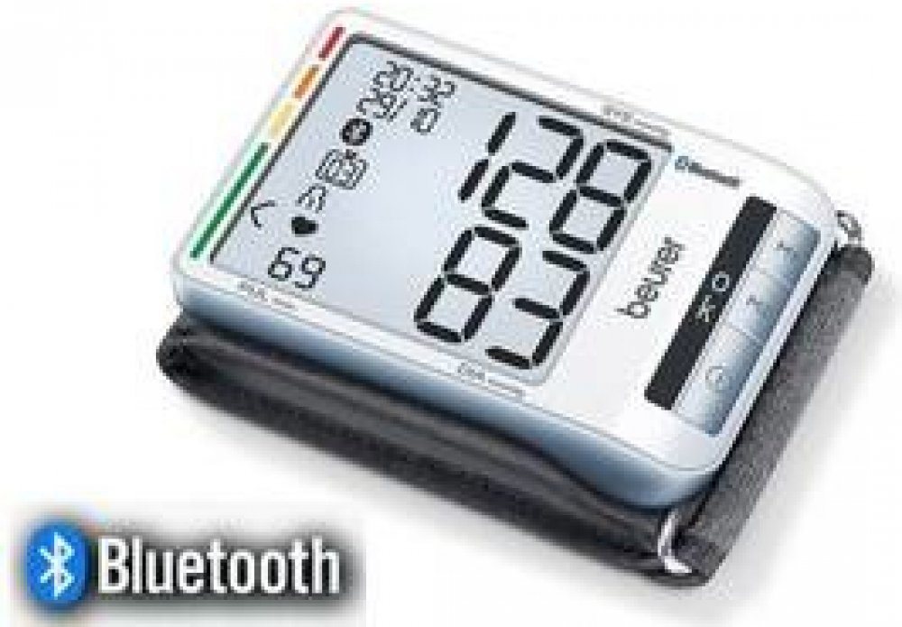 Beurer bílá, šedá bateriové 120 měření na zápěstí pro cestování (na baterie) klinicky validované pro páry (2 profily) oscilometrické automatické 100 g pro synchronizaci s telefonem (Bluetooth/aplikace) pro malé paže integrovaná bez hadičky