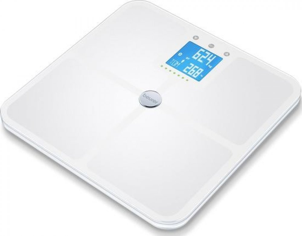 Elegantně orámovaná váha z diagnostického skla s mimořádně velkou platformou ITO Těhotenský režim pro kontrolu hmotnosti během těhotenství bez technologie BIA). Funkce tárování pro vážení s dětmi do 2 let. Zobrazuje čas a teplotu. Propojení chytrého telefonu a váhy do sítě - mějte přehled o naměřených hodnotách a tělesných údajích doma nebo na cestách. Technologie Bluetooth® low energy. Ke stažení je k dispozici aplikace Beurer HealthManager. Automatický přenos dat přes Bluetooth® po otevření aplikace. Modře podsvícený dvouřádkový displej s bodovou maticí a bílými číslicemi. Motivační LED dioda (zobrazuje na displeji různé barvy v závislosti na výsledku). Elektrody z kartáčované oceli. Moderní dotykové tlačítko. Velikost číslic 23 mm pro výsledky hmotnosti. Výpočet tělesné hmotnosti, tělesného tuku, vody v těle, svalové hmoty, kostní hmoty. BMI (Body Mass Index) / AMR (Active Metabolic Rate) / BMR (Basic Metabolic Rate) a BMI (Body Mass Index). Třídění: 0,1 % pro tělesný tuk, tělesnou vodu a svalovou hmotu, 100 g pro tělesnou hmotnost a kostní hmotu. Režim aktivity s 5 úrovněmi aktivity. nosnost 180 kg. 8 uživatelských pamětí s 30 paměťovými místy. Automatické vypnutí. Rychlé spuštění. Volitelná jednotka hmotnosti kg / lb / ks. indikátor přetížení 4 x AAA 1,5 V baterie jsou součástí dodávky. Rozměry 32 x 32 x 2,4 cm.- Těhotenský režim (měření bez BIA) Funkce tárování pro vážení s dětmi do 2 let - Měření tělesné hmotnosti, tělesného tuku, vody v těle, svalové hmoty a hmotnosti kostí - Zobrazuje AMR / BMR / BMI - Motivační LED dioda (zobrazuje různé barvy v závislosti na výsledku) - Zobrazuje čas a teplotu - Spolupracuje s aplikací Beurer HealthManager - Režim sportovce s 5 úrovněmi aktivity - 8 uživatelských pamětí - 30 pamětí - Nosnost 180 kg