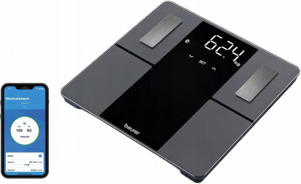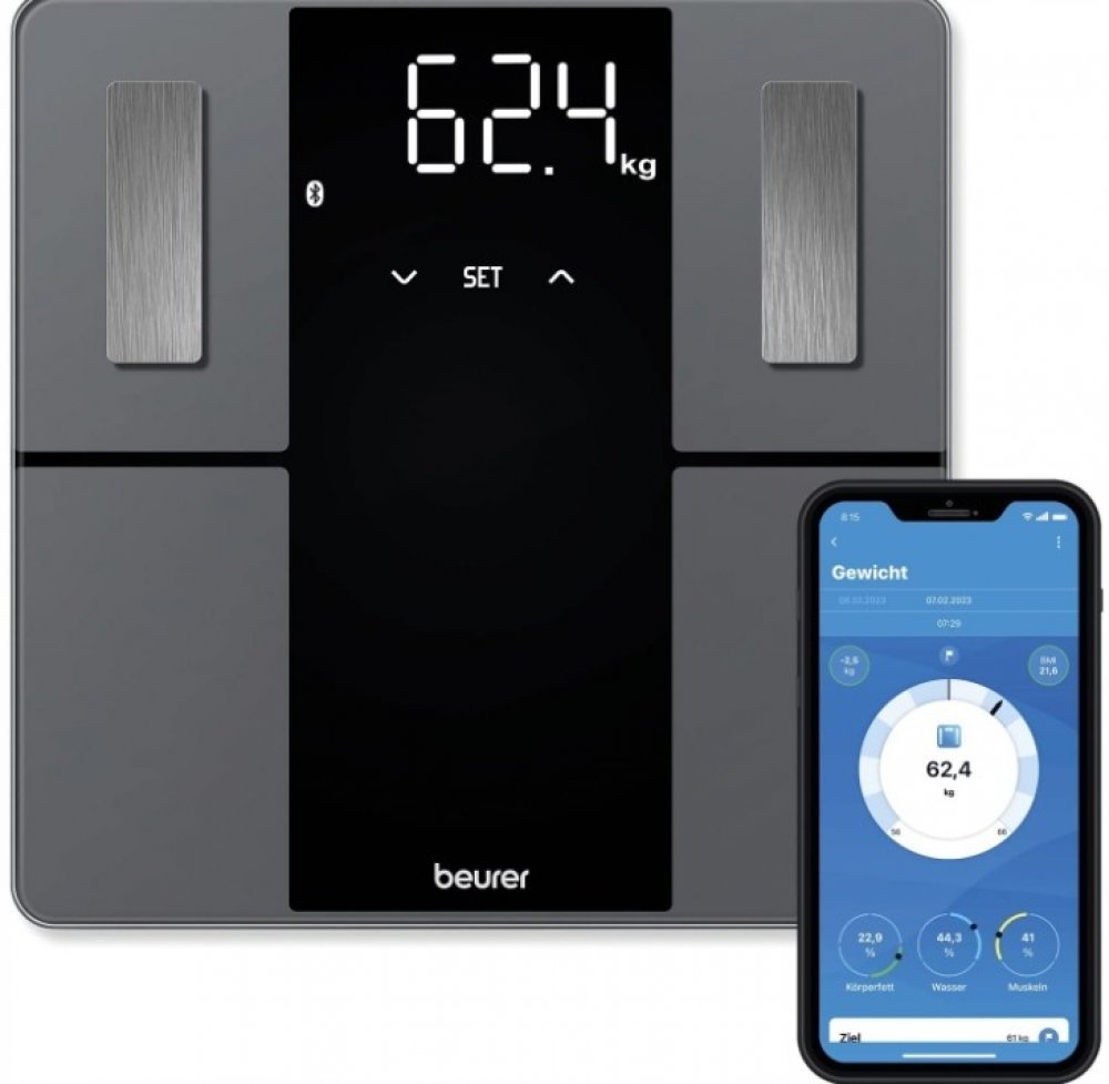 Diagnostická váha Beurer, BF 500 má nadčasový design s celoskleněným povrchem a neviditelným displejem. Elektrody mají titanový povrch pro přesné měření. S nosností až 180 kg je vhodná pro většinu uživatelů. Má také paměť pro 8 uživatelů, takže si můžete ukládat své výsledky a sledovat svůj pokrok. Aby byla co nejjednodušší k použití, provoz této váhy vyžaduje pouze 3 baterie typu AA. S touto diagnostickou váhou získáte komplexní pohled na své zdraví a fitness. Díky aplikaci Beurer HealthManager Pro můžete všechna data snadno spravovat a sledovat svůj pokrok. Sledujte své tělesné parametry a spravujte své zdraví efektivněji než kdy dříve. Analyzér Beurer BF 500 zahrnuje tyto měření: Tělesnou váhu: Klasické měření váhy, které vám pomáhá udržovat kontrolu nad vaší hmotností. Tuk v těle: Zjistěte, kolik procent tělesného tuku máte, což je důležitý ukazatel zdraví. Voda v těle: Sledujte hladinu tělesné vody, což může být klíčové pro udržení hydratace. Svalovou hmotu: Měřte svou svalovou hmotu, což je důležité pro vaši fyzickou kondici. BMI (Body Mass Index): Zjistěte, zda je vaše hmotnost v souladu s vaší výškou. Metabolický věk: Tato funkce vám ukáže, jak rychle stárnete vzhledem k vašemu metabolismu. BMR/AMR (Basal Metabolic Rate/Ambient Metabolic Rate): Tato funkce vám dává informace o vašem bazálním a okolním metabolickém tempu, což vám může pomoci s plánováním výživy. Kostní hmotu: Měřte svou kostní hmotu, což je důležité pro zdraví kostí. Objednávejte pod kat. číslem BEU-BF500