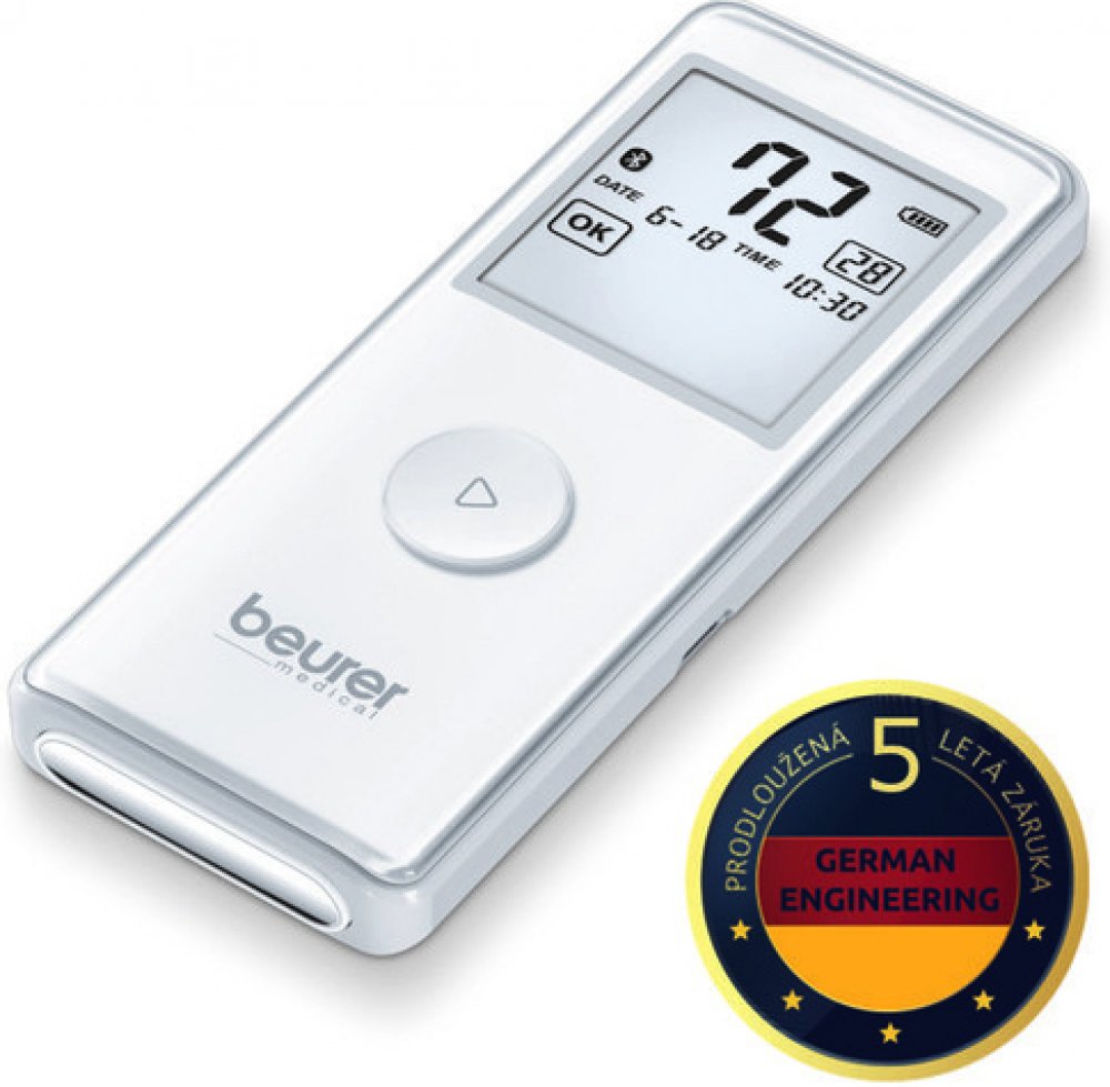 Mobilní EKG přístroj Beurer ME 90 je kompatibilní s aplikací pro záznam a monitorování srdečního rytmu. Tento přístroj umožňuje snadno zaznamenávat a ovládat svůj srdeční rytmus doma nebo na cestách. Data lze přenést do chytrého telefonu přes Bluetooth® a vyhodnotit v přidružené aplikaci „beurer HealthManager Pro“. EKG přístroj poskytuje optimální kontrolu srdečního rytmu a umožňuje vlastní monitorování srdeční funkce. Bezdrátový přenos výsledků měření je vhodný pro lidi s vysokým krevním tlakem, vysokým cholesterolem, cukrovkou, rodinnou anamnézou, obezitou, nedostatkem pohybu, nadměrnou konzumací tabáku, stresem, nedostatkem spánku nebo po předchozích infarktech a mrtvicích. Doba záznamu je 30 sekund a nahrávání lze provádět pomocí různých metod, jako je hrudník-paže-ruka nebo ruka-paže-horní část těla-paže-ruka. Po ukončení záznamu přístroj poskytne okamžité informace o srdečním rytmu. Přístroj má 36 úložných prostor a je vybaven PC rozhraním přes USB kabel, který je součástí balení. PC software umožňuje podrobnější zobrazení a vyhodnocení dat. Beurer ME 90 má funkce jako datum a čas, automatické vypnutí a indikátor stavu baterie. Jedná se o zdravotnické zařízení, které zahrnuje bezplatnou aplikaci „beurer HealthManager Pro“, takže měření a tělesná data máte vždy na očích. Přístroj detekuje arytmie a změněné křivky, jako je AFIB a PVC. Objednávejte pod kat. číslem BEU-ME90