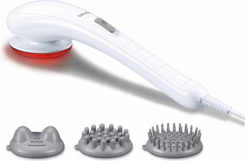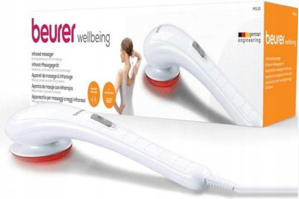 Ruční masážní přístroj Beurer MG 21 vám zajistí příjemnou a blahodárnou masáž v pohodlí domova. Relaxačně a povzbudivá masáž je zvláště vhodná při léčbě natažených svalů, bolestí a únavy. Tento přístroj disponuje infračerveným zářením, které posiluje účinek masáže, přičemž pokožku prohřívá nejen na povrchu, ale podporuje i její prokrvení. Tak jsou prohřáty i hlubší vrstvy tkáně a svalstva. Součástí balení jsou tři vyměnitelné nástavce pro různé druhy masáží. Volit můžete rovněž mezi třemi stupni intenzity masáže. Ergonomický design pak zaručuje snadnou manipulaci a vysoce komfortní využití.