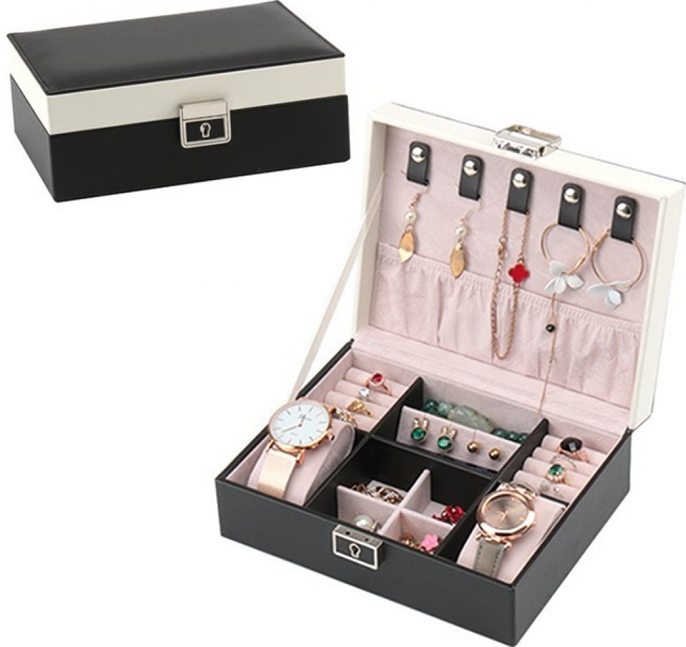 Šperkovnice Bezdoteku je perfektní volbou pro ochranu vašich klenotů. Syntetická kůže zaručuje luxusní vzhled a bezproblémovou údržbu. Klíčové vlastnosti šperkovnice Elizabeth černo-bílá Šperkovnice Bezdoteku je perfektním řešením pro uložení vašich cenností Je ze syntetické kůže Šperkovnice Bezdoteku měří 7,5 × 16,5 × 20,5 cm (vך×h) Její barva je černá