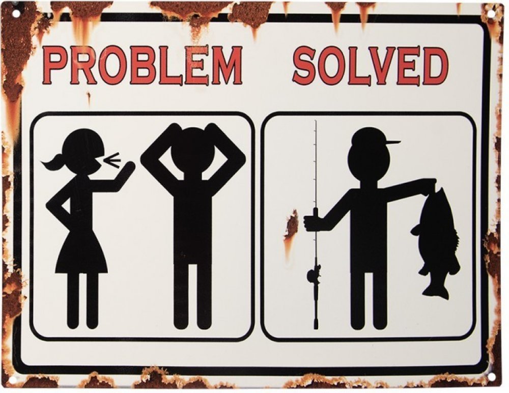 Dekorativní vtipná bílá textová tabule s obrázkem hádající se ženy a muže a úniku na rybaření v retro stylu.