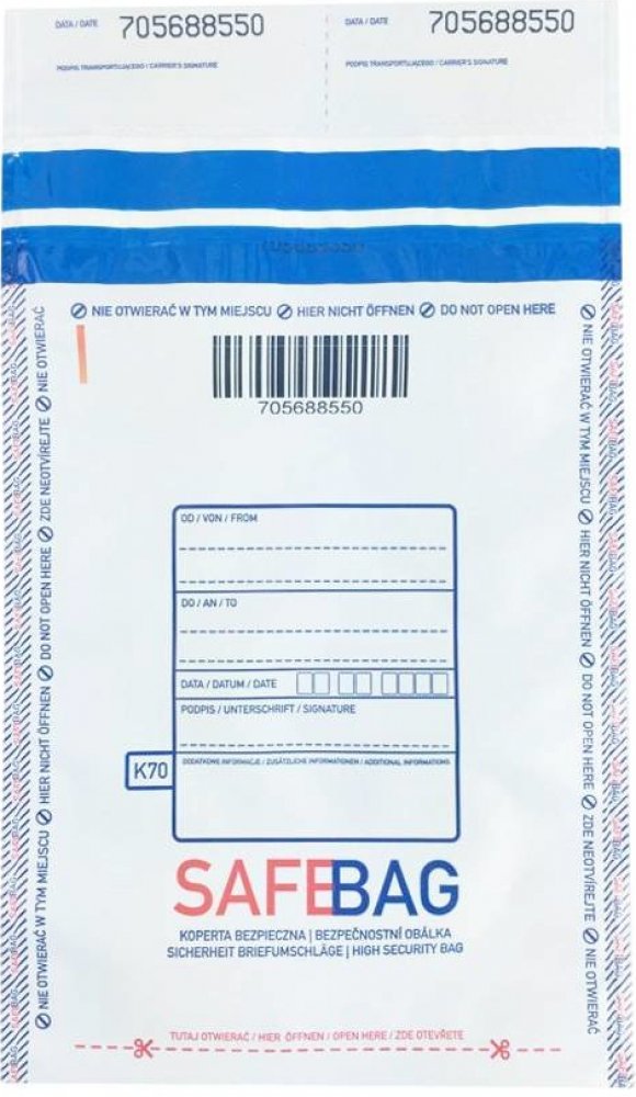 Obálky SafeBag z LDPE fólie se speciálním uzávěrem, určeno pro posílání zasilek v režimu: tajné, přísně, tajné. Obálka je opatřena uzávěrem, který rozponá pokus neoprávněného zásahu do obsahu obálky. Číselník umožňuje přesnou identifikaci zásilky a sledování během celého přepravního procesu. Také plní roli potvrzení převzetí ve formě lehce odnímatelné poukázky. Bezpečnostní obálky jsou určené pro banky, í finanční instituce, bezpečnostní agentury, obchody, čerpací stanice. Využití naleznou ve firmách pro přepravu a uchovávání peněz, osobních složek, projektů, datových nosičů, kreditních karet, klíčí k chráněným místnostem (a ostatních depozitů). Díky bezpečnostním systémům, bezpečnostní obálky SAFEBAG levně a jednoduše zaručuji ochranné vlastnosti sejfů nebo obrněných pokladen.