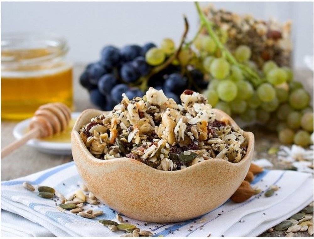 Směs kokosových lupínků, rozinek, oříšků a spousty semínek, slazená medem a dokřupava zapečená.