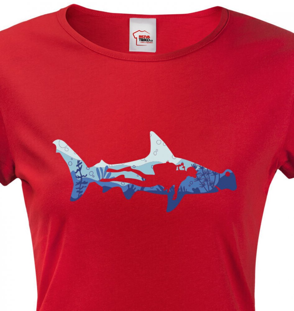 Bezvatriko.cz Dámské tričko Potápěč a žralok Červená