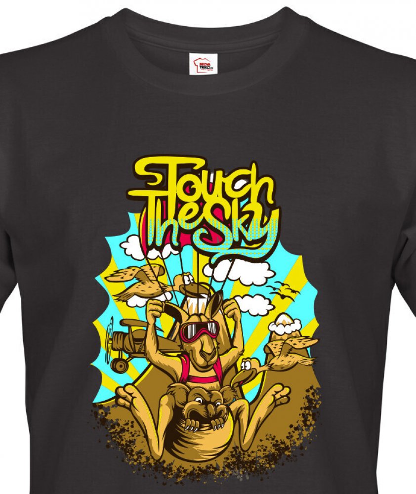 Toto pánské vtipné tričko s potiskem klokana a nápisem "Touch the Sky" přináší na svět humor a odvahu v jedinečném spojení. Na přední straně trička se nachází nezapomenutelný obrázek, který rozesměje každého, kdo na něj pohlédne. Tento originální design zobrazuje klokana, jak si dělá legraci z tradice svého druhu, a místo skákání po australské krajině, se rozhodl vydat na opravdu velké dobrodružst...