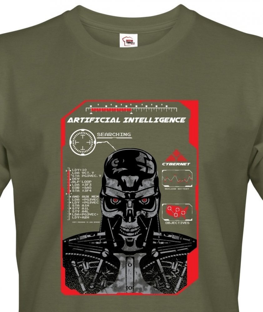 Tričko s kvalitním potiskem Terminátora s nápisem Artificial intelligence - umělá inteligence robota T-800, který byl vyslán aby zabil Sarah Connorovou dříve než zplodí syna, který se má později stát vůdcem ve válce proti strojům. Terminátora si zahrála velká filmová hvězda Arnold Schwarzenegger. Terminátor je filmová klasika, která vz
