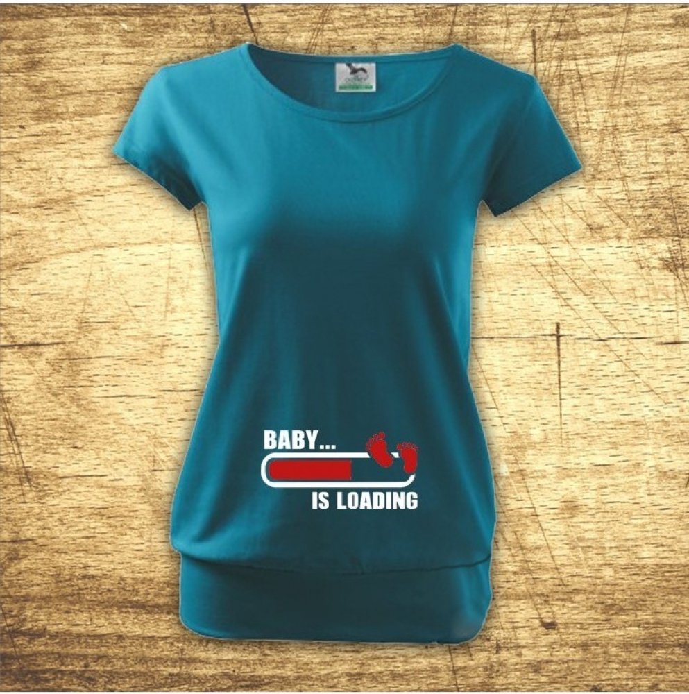 Další tričko z naší vtipné těhotenské kolekce. Těhotenské tričko Baby…is loading (Děťátko se nahrává) nesmí zkrátka chybět v žádné skříni nastávající maminky. Triko můžete koupit v několika atraktivních barvách. Na tričko vám také rádi dotiskneme jméno dětátka nebo měsíc narození.